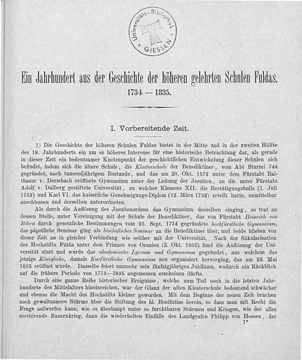 Als durch die Auflösung des Jesuitenordens das Gymnasium desselben einging, so trat an dessen Stelle, unter Vereinigung mit der Schule der Benediktiner, das von Fürstabt Heinrich von Bibra durch gesetzliche Bestimmungen vom 23. Sept. 1774 gegründete hochfürstliche Gymnasium, das päpstliche Seminar ging als bischöfliches Seminar an die Benediktiner über, und beide blieben von dieser Zeit an in gleicher Verbindung wie seither mit der Universität. Nach der Säkmularisation des Hochstifts Fulda unter dem Prinzen von Oranien(2. Okt. 1802) fand die Auflösung der Uni- versität statt und wurde das akademische Luceum und Gymnasium gegründet, aus welchem das jetzige Königliche, damals Kurfürstliche Gymnasium neu organisiert hervorging, das am 25. Mai 1835 eröffnet wurde. Dasselbe feiert nunmehr sein fünfzigjähriges Jubiläum, wodurch ein Rückblick auf die frühere Periode von 1773— 1835 angemessen erscheinen dürfte.