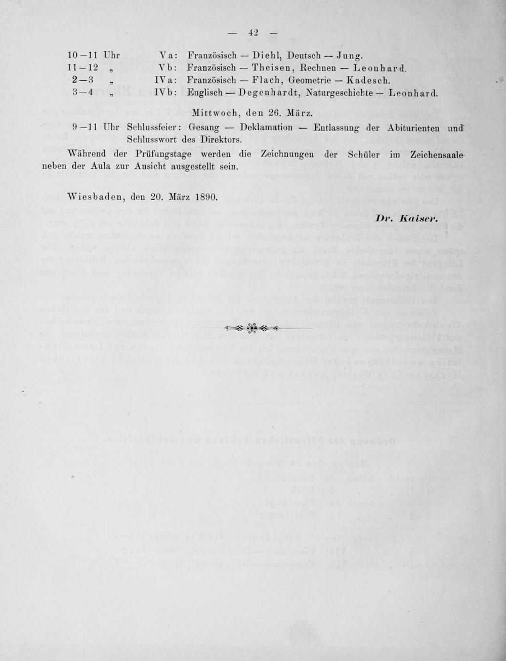 10— 11 Uhr Va: Französisch— Diehl, Deutsch— Jung. 11—12„ Vb: Französisch— Theisen, Rechnen— Leonhard. 2—3„ IVa: Französisch— Flach, Geometrie— Kadesch. 3— 4„ IVb: Englisch— Degenhardt, Naturgeschichte— Leonhard. Mittwoch, den 26. März. 9— 11 Uhr Schlussfeier: Gesang— Deklamation— Entlassung der Abiturienten und
