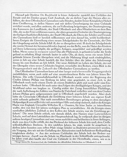 Hierauf gab Direktor Dr. Buchhold in ſeiner Anſprache zunächſt den Gefühlen der Freude und des Dankes gegen Gott Ausdruck, die an dieſem Tage die Herzen aller er- füllten, die dem Offenbacher Gymnaſium nahe ſtünden, dankte Seiner Königlichen Hoheit dem Groſherzog, in deſſen Dlamen und mit deſſen Genehmigung das neue Gebäude errichtet wurde, und allen anderen, die zur Vollendung beigetragen, der Staatsregierung, den Kammern der Landſtände, der Stadt Offenbach und allen Mitarbeitern an dem Bau. Alle, die zu der Feier erſchienen waren, die oben genanntenVertreter der Staatsregierung, der hieſigen ſtaatlichen Behörden, der Stadt Offenbach, die Eltern der Schüler und Freunde des Gymnaliurns hieß er herzlich willkommen und wies darauf hin, welch hochbedeut- ſames Ereignis die Einweihung eines neuen Schulgebäudes für die Gemeinde, die Orte der Umgebung und die Schule felbſt iſt, der es übergeben wird. Iſt doch das Schulgebäude die zweite Heimat der heranwachlfenden Jugend, wo das Beſte, was die MNatur den Kindern auf ihren Lebensweg mitgibt, die geiſtigen Anlagen, ausgebildet und gekräftigt werden ſollen. Mens sana in corpore sanol Das alte Mahnwort, in geſundem Leibe die Seele geſund zu erhalten, klingt niemals lauter in unſer Ohr, als dann, wenn ein neues Schul- gebäude ſeinem Zwecke übergeben wird, und die Mahnung klingt noch eindringlicher, wenn es ſich um eine Schule handelt, die ihre Schüler über die Jahre des Schulzwangs hinaus bis zum Studium an ſich feſſelt. Der neue Abſchnitt im Leben der Schule, der mit der UÜbergabe eines neuen Gebäudes beginnt, veranlaſtte den Redner, einen Blick in die Vergangenheit und die Zukunft des Offenbacher Gymnaſiums zu werfen.