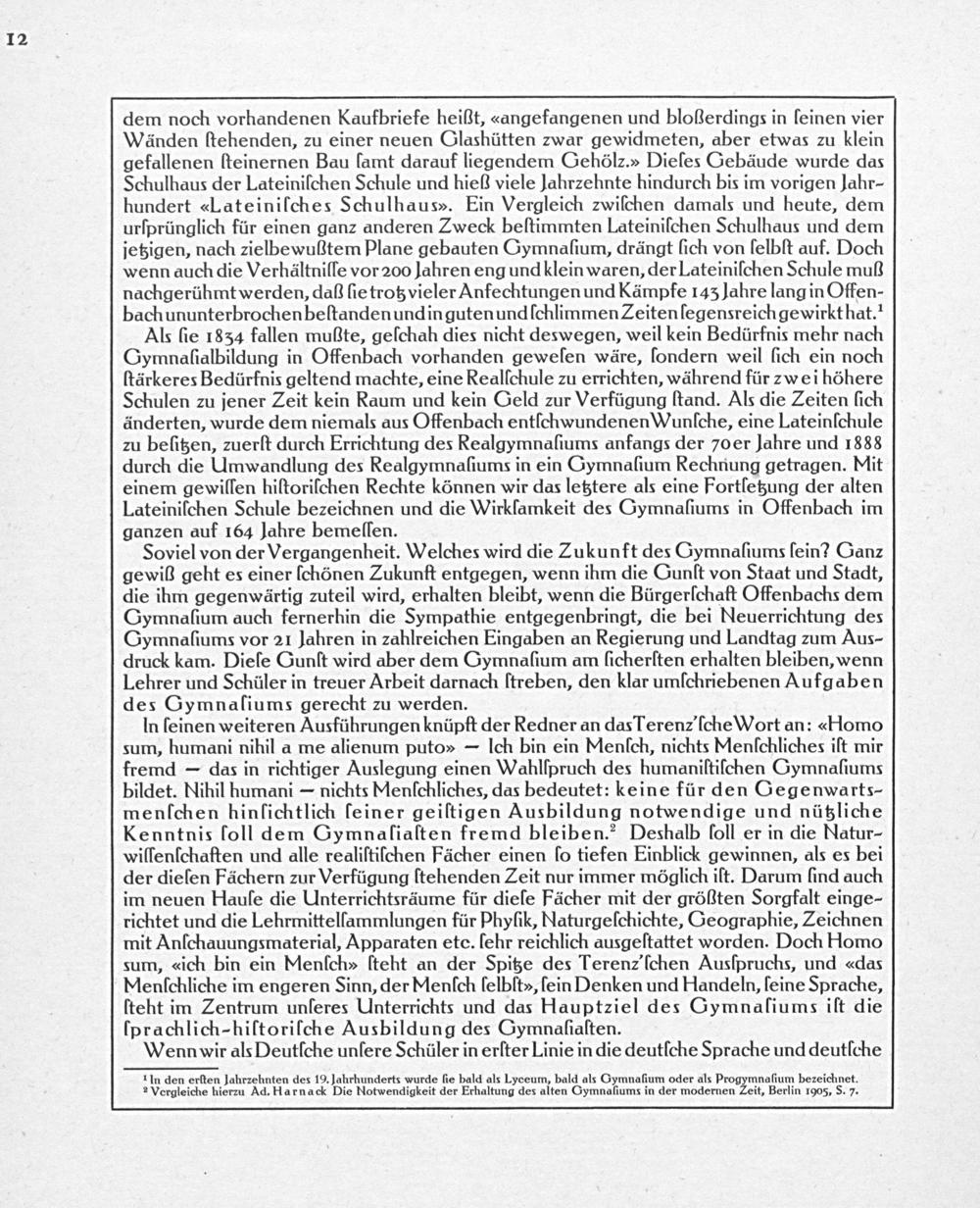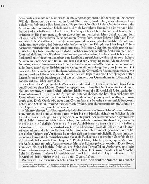 In ſeinen weiteren Ausführungen knüpſt der Redner an das Terenz'ſche Wort an:«Homo sum, humani nihil a me alienum putoy— Ich bin ein Menſch, nichts Menſchliches iſt mir freind— das in richtiger Auslegung einen Wahlſpruch des humaniſtiſchen Gymnaſiums bildet. Nihil humani— nichts Menſchliches, das bedeutet: keine für den Gegenwarts- menſchen hinfichtlich feiner geiſtigen Ausbildung notwendige und nützliche Kenntnis foll dem Gymnaliaſten fremd bleiben.* Deshalb ſoll er in die Natur- wiſſenſchaften und alle realiſtiſchen Fächer einen ſo tiefen Einblick gewinnen, als es bei der dieſen Fächern zur Verfügung ſtehenden Zeit nur immer möglich iſt. Darum ſind auch im neuen Hauſe die Unterrichtsräume für dieſe Fächer mit der größtten Sorgfalt einge- richtet und die Lehrmittelſammlungen für Phyſik, Naturgeſchichte, Geographie, Zeichnen mit Anſchauungsmaterial, Apparaten etc. ſehr reichlich ausgeſtattet worden. Doch Homo sum,«ich bin ein Menſch» ſteht an der Spitze des Terenz'ſchen Ausſpruchs, und das Menſchliche im engeren Sinn, der Menſch ſelbſto, ſein Denken und Handeln, ſeine Sprache, ſteht im Zentrum unſeres Unterrichts und das Hauptziel des Gymnaliums iſt die ſprachlich-hiftoriſche Ausbildung des Gymnalſiaſten.