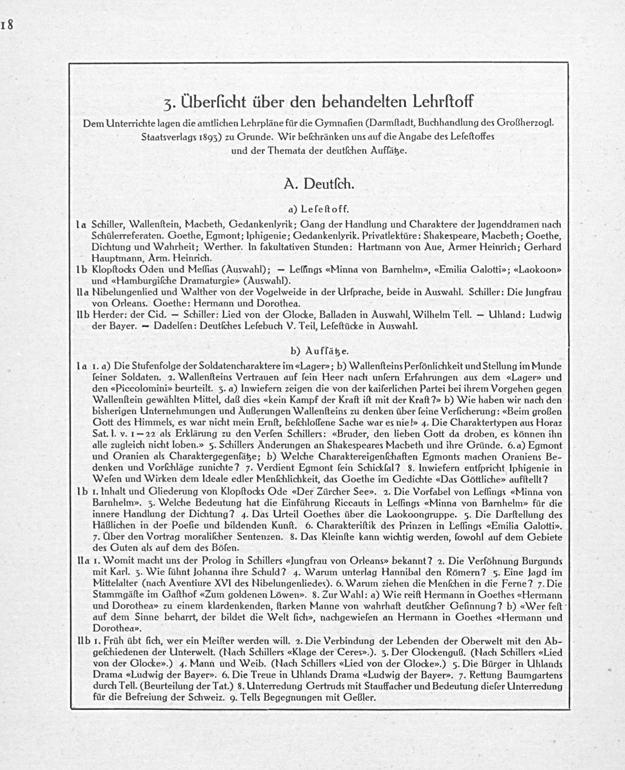Ib 1. Inhalt und Gliederung von Klopſtocks Ode Der Zürcher Seev. 2. Die Vorfabel von Leſſings Minna von Barnhelm». 3. Welche Bedeutung hat die Einführung Riccauts in Leſſings«Minna von Barnhelm für die innere Handlung der Dichtung? 4. Das Urteil Goethes über die Laokoongruppe. 5. Die Darſtellung des Häßlichen in der Poeſie und bildenden Kunſt. 6. Charakteriſtik des Prinzen in Leſſings«Emilia Galottiv. 7. UÜber den Vortrag moraliſcher Sentenzen. 8. Das Kleinſte kann wichtig werden, ſowohl auf dem Gebiete des Guten als auf dem des Böſen.