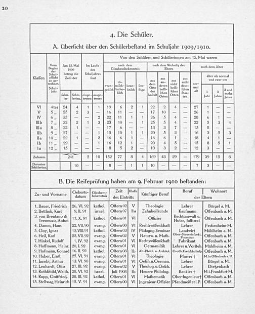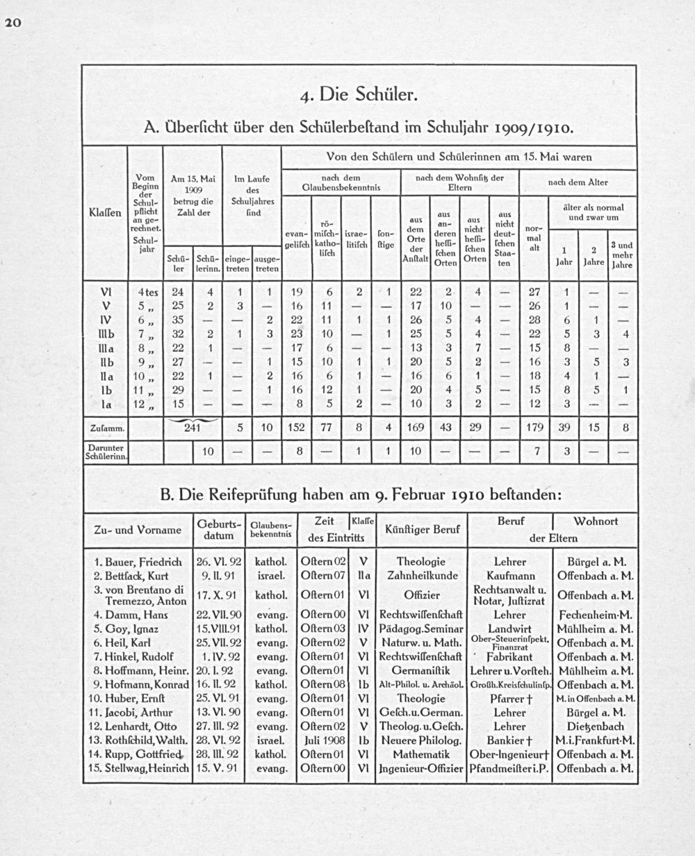 Von den Schülern und Schülerinnen am 15. Mai waren v ch d h dem Wohmfit d beginn A 13.nei 9 Len f4 Glanberahekenntuſs STern nüt der nach dem AMter er Schul- betrug die Schuljahres 2 klaſſen pflicht Zahl der ſind aus aus Ken a8. Tornal an ge- rö- aus an- aus nicht rechnet. iſch-ſi bon⸗- dem d nicht deut- nor- evan-mit israe- lon Orte geren heſſ- leut. mal Sehul⸗ velih katho ltilch ſige, der, holfe(hen(chen, ait 1 2[2una 4 3: 1. en aa- h iees eue awdon wem dlan Ouen,Onen ten dair lere jaire VI 4tes 24 4 1 1 19 6 2 1 22 2. 4— 27 1—— V 5„ 25 2 3— 16 11—— 17 10—— 206 1—— w 6„ 35—— 2 22 11 1 1 26 5 4— 28 6 1— Iub 7„ 32 2 1 3 23] 10— 1 25 5 4— 22 5 3 4 ma 8„ 22 j—— 17 6°—— 13 3 7— 15 3—— llb 9„ 27—— 1 15 10 1 1 20 5 2— 16 3 5 3 la 10, 22 1— 2 16 6(1= 16 6 1— 1s 4 1— lb[il, 292— 1 16 12 1— 20] 4 5— 15 3 351 1a 12„ 15——— 3 5 2— 10 3 2— 12 3—— Zutamm. e, l5 i10[s. 77 8s 4 169 43 29— 179 39 15 8 Bier MEA B. Die Reifeprüfung haben am 9. Februar 1910 beſtanden: Geburts- Glaubens- Zeit ſklafſte. Beruf Wohnort Zu- und Vorname nen deaene des e Künſtiger Beruf der Eitern 1. Bauer, Friedrich[26. VI. 92 kathol. Oſtern 02 V Theologie Lehrer Bürgel a. M. 2. Bettlack, Kurt 9. II. 91 israel. Oſtern07] la Zahnheilkunde Kaufmann Offenbach a. M. 3. von Brentano di; Rechtsanwalt u. Tremeczo, Anton 17. X. 91 athoh, Oſternol VI Offizier Hiotar, Iuſtiarat Offenbach a. M. 4. Damm, Hans 22. VII. 90 evang. Oſtern 00 VI Rechtswiſſenſchaft Lehrer Fechenheim.M. 5. Goy, lgnaz 15. VIII.91ſkathol. Oſtern 03 IVPädagog. Seminar Landwirt Mühlheim a. M. 6. Heil, Karl 25. VII. 92]ſevang. OſternO? V hlaturw. u. Math. Ober Shaerinſpolt. Offenbach a. M. 7. Hinkel, Rudolf 1. V. 92 evang. OſternOl] VI Rechtswiſſenſchaft Fabrikant Offenbach a. M. 8. Hoffmann, Heinr.] 20. I. 92 evang. OſternOl VI Germaniſtik[Lehrer u. Vorſteh. Mühlheim a. M. 9. Hofmann, Konrad] 16. lI. 92 kathol.[Oſtern 08 Ib[Alt-Philol. u. Archäol.] Grofih. Kreisſchulinſp. Offenbach a. M. 10. Huber, Ernſt 25. VI. 91 hevang. OſternOl VI Theologie Pfarrer †. in Offenbach a. M. 11. Jacobi, Arthur 13. VI. 90 evang. OſternOl VI Geſch. u. German. Lehrer Bürgel a. M. 12. Lenhardt, Otto[27. III. 92 evang. Oſtern02 VTheolog. u. Geſch. Lehrer Dietzenbach 13. Rothſchild, Walth. 28. VI. 92 israel. luli 1908 Ib euere Philolog. Bankier † M.i. Frankfurt-M. 14. Rupp, Gottfried. 28. III. 92] kathol.(OſternOl] VI Mathematik(Ober-Ingenieurt] Offenbach a. M. 15. Stellwag, Heinrich 15. V. 9Aevang. Oſtern00 VI Ingenieur-Offizier Pfandmeiſteri. P.] Offenbach a. M.