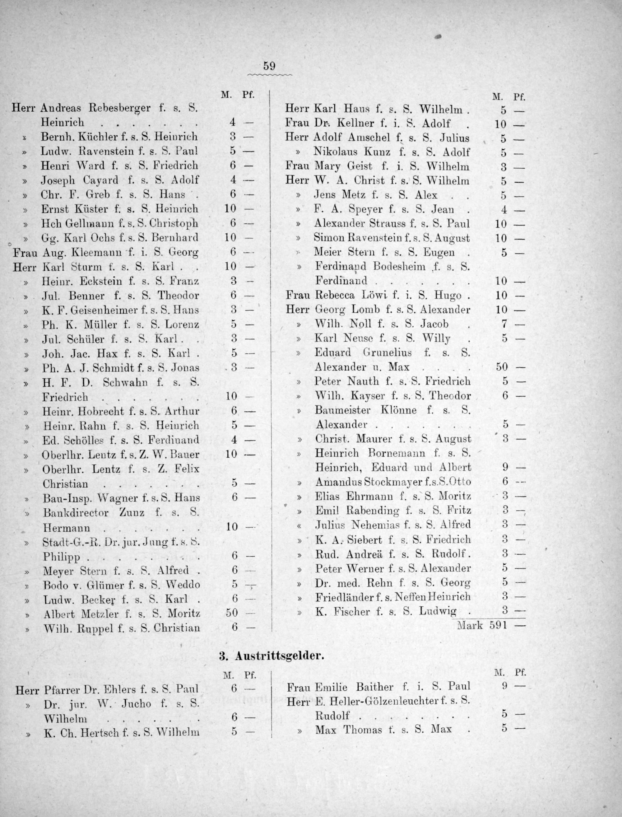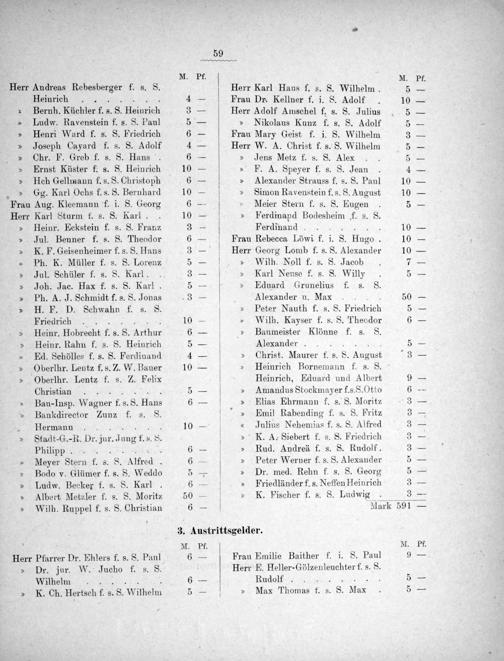 M. Karl Haus f. s. S. Wilhelm. 5 Dr. Kellner f. i. S. Adolf. 10 Adolf Amschel f. s. S. Julius 5 Nikolaus Kunz f. s. S. Adolf 5 Mary Geist f. i. S. Wilhelm 3 W. A. Christ f. s. S. Wilhelm 5 Jens Metz f. s. S. Alex. 5 F. A. Speyer f. s. S. Jean 4 Alexander Strauss f. s. S. Paul 10 Simon Ravenstein f. s. S. August 10 Meier Stern f. s. S. Eugen 5 Ferdinapd Bodesheim f. s. S. Ferdinand... 10 Rebecca Löwi f. i. 8. HIngo. 10 Georg Lomb f. s. S. Alexander 10 Wilh. Noll f. s. S. Jacob 7 Karl Neuse f. s. S. Willy 5 Eduard Grunelius f. s. S. Alexander u. Max 50 Peter Nauth f. s. 8. PFriedrich 5 Wilh. Kayser f. s. 8. Theodor 6 Baumeister Klönne f. s. S. Alexander... 5 Christ. Maurer f. s. S. August 3 Heinrich Bornemann f. s. S. Heinrich, Eduard und Albert 9 Amandus Stockmayer f.s.S. Otto 6 Elias Ehrmann f. s. S. Moritz.3 Emil Rabending f. s. 88 Fritz 3 Julius Nehemias f. s. S. Alfred 3 K. A. Siebert f. s. S. eAeen 3 Rud. Andreä f. s. S. Rudolf. 3 Peter Werner f. s. S. Alexander 5 Dr. med. Rehn f. s. S. Georg 5 Friedländer f. s. Neffen Heinrich 3 K. Fischer f. s. S. Ludwig 3