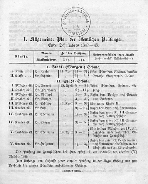 Klaſſe. Namen Zeit der Prüfung. Lebrgegenſtände jeder Klaſſe Klaſſenlehrer. Tag. Uhr.(außer confeſſ. Religionslehre.) I. Stadt⸗(Morgen⸗) Schule.