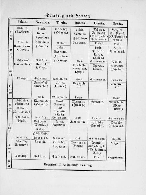 Steingaß. Herling. Weismann. Heß. Lauten. Gutermann. V Phyſik. Geſchichte. Latein. Jacobs Clio. Deutſche Deutſche 3(Schmidt.) Repetition. Stylarbeit. Grammatik.