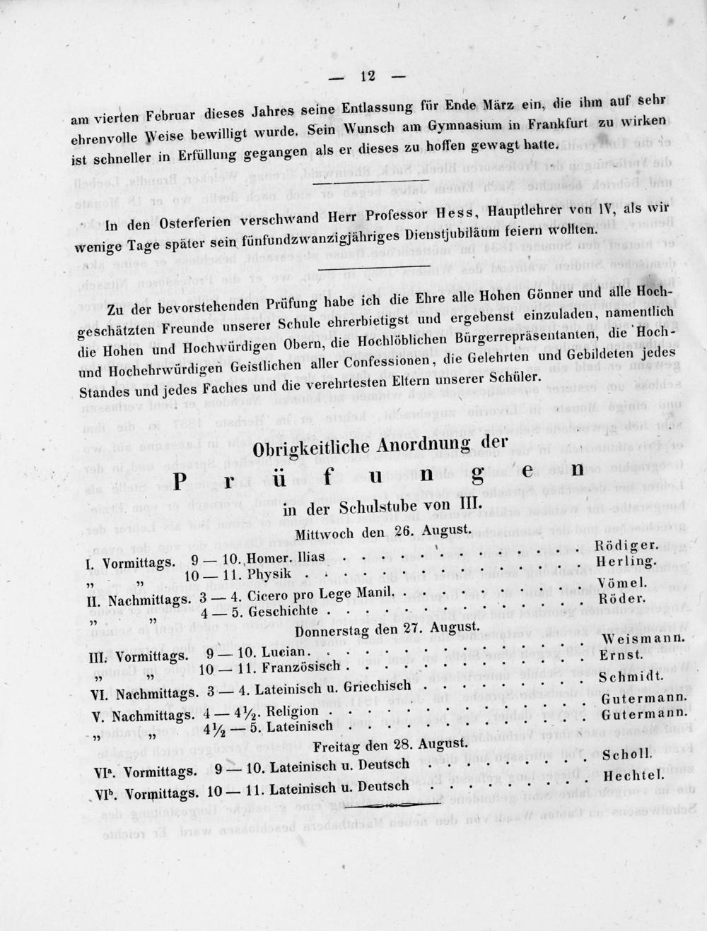 Zu der bevorstehenden Prüfung habe ich die Ehre alle Hohen Gönner und alle Hoch- geschätzten Freunde unserer Schule ehrerbietigst und ergebenst einzuladen, namentlich die Hohen und Hochwürdigen Obern, die Hochlöblichen Bürgerrepräsentanten, die Hoch- und Hochehrwürdigen Geistlichen aller Confessionen, die Gelehrten und Gebildeten jedes Standes und jedes Faches und die verehrtesten Eltern unserer Schüler.