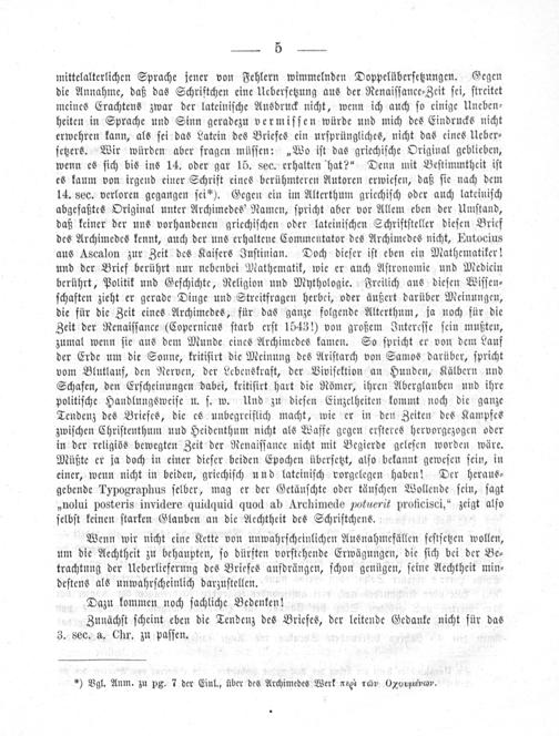 mittelalterlichen Sprache jener von Fehlern wimmelnden Doppelüberſetzungen. Gegen die Annahme, daß das Schriftchen eine Ueberſetzung aus der Renaiſſance⸗Zeit ſei, ſtreitet meines Erachtens zwar der lateiniſche Ausdruck nicht, wenn ich auch ſo einige Uneben⸗ heiten in Sprache und Sinn geradezu vermiſſen würde und mich des Eindrucks nicht erwehren kann, als ſei das Latein des Briefes ein urſprüngliches, nicht das eines Ueber⸗ ſetzers. Wir würden aber fragen müſſen:„Wo iſt das griechiſche Original geblieben, wenn es ſich bis ins 14. oder gar 15. sec. erhalten hat?“ Denn mit Beſtimmtheit iſt es kaum von irgend einer Schrift eines berühmteren Autoren erwieſen, daß ſie nach dem 14. sec. verloren gegangen ſei*). Gegen ein im Alterthum griechiſch oder auch lateiniſch abgefaßtes Original unter Archimedes' Namen, ſpricht aber vor Allem eben der Umſtand, daß keiner der uns vorhandenen griechiſchen oder lateiniſchen Schriftſteller dieſen Brief des Archimedes kennt, auch der uns erhaltene Commentator des Archimedes nicht, Eutocius aus Ascalon zur Zeit des Kaiſers Juſtinian. Doch dieſer iſt eben ein Mathematiker! und der Brief berührt nur nebenbei Mathematik, wie er auch Aſtronomie und Medicin berührt, Politik und Geſchichte, Religion und Mythologie. Freilich aus dieſen Wiſſen⸗ ſchaften zieht er gerade Dinge und Streitfragen herbei, oder äußert darüber Meinungen, die für die Zeit eines Archimedes, für das ganze folgende Alterthum, ja noch für die Zeit der Renaiſſance(Copernicus ſtarb erſt 1543!) von großem Intereſſe ſein mußten, zumal wenn ſie aus dem Munde eines Archimedes kamen. So ſpricht er von dem Lauf der Erde um die Sonne, kritiſirt die Meinung des Ariſtarch von Samos darüber, ſpricht vom Blutlauf, den Nerven, der Lebenskraft, der Viviſektion an Hunden, Kälbern und Schafen, den Erſcheinungen dabei, kritiſirt hart die Römer, ihren Aberglauben und ihre politiſche Handlungsweiſe u. ſ. w. Und zu dieſen Einzelheiten kommt noch die ganze Tendenz des Briefes, die es unbegreiflich macht, wie er in den Zeiten des Kampfes zwiſchen Chriſtenthum und Heidenthum nicht als Waffe gegen erſteres hervorgezogen oder in der religiös bewegten Zeit der Renaiſſance nicht mit Begierde geleſen worden wäre. Müßte er ja doch in einer dieſer beiden Epochen überſetzt, alſo bekannt geweſen ſein, in einer, wenn nicht in beiden, griechiſch und lateiniſch vorgelegen haben! Der heraus⸗ gebende Typographus ſelber, mag er der Getäuſchte oder täuſchen Wollende ſein, ſagt „nolui posteris invidere quidquid quod ab Archimede potuerit proficisci,“ zeigt alſo ſelbſt keinen ſtarken Glauben an die Aechtheit des Schriftchens.