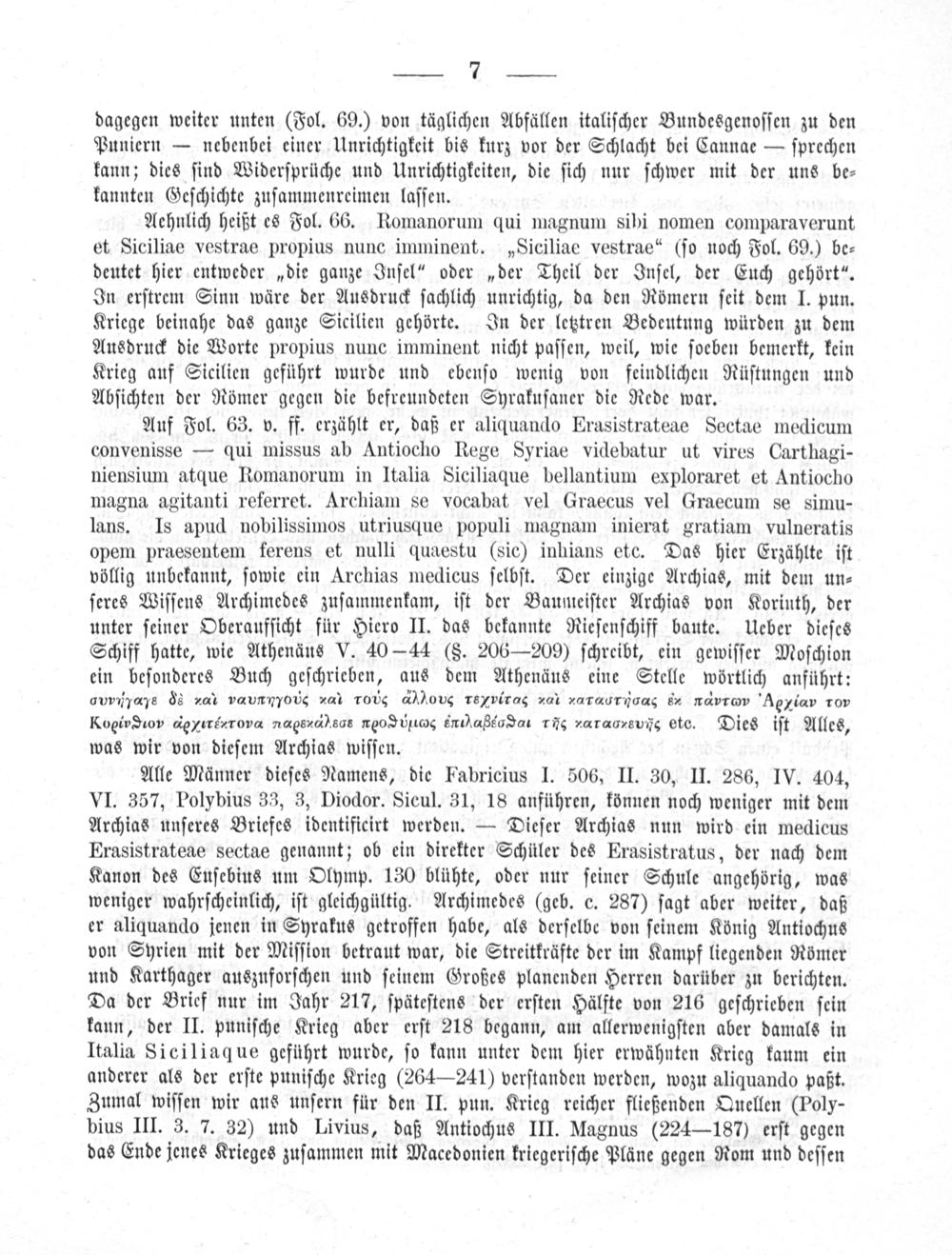 Alle Männer dieſes Namens, die Fabricius I. 506, II. 30, II. 286, IV. 404, VI. 357, Polybius 33, 3, Diodor. Sicul. 31, 18 anführen, können noch weniger mit dem Archias unſeres Briefes identificirt werden.— Dieſer Archias nun wird ein medicus Erasistrateae sectae genannt; ob ein direkter Schüler des Erasistratus, der nach dem Kanon des Enſebius um Olymp. 130 blühte, oder nur ſeiner Schule angehörig, was weniger wahrſcheinlich, iſt gleichgültig. Archimedes(geb. c. 287) ſagt aber weiter, daß er aliquando jenen in Syrakus getroffen habe, als derſelbe von ſeinem König Antiochus von Syrien mit der Miſſion betraut war, die Streitkräfte der im Kampf liegenden Römer und Karthager auszuforſchen und ſeinem Großes planenden Herren darüber zu berichten. Da der Brief nur im Jahr 217, ſpäteſtens der erſten Hälfte von 216 geſchrieben ſein kann, der II. puniſche Krieg aber erſt 218 begann, am allerwenigſten aber damals in Italia Siciliaque geführt wurde, ſo kann unter dem hier erwähnten Krieg kaum ein anderer als der erſte puniſche Krieg(264— 241) verſtanden werden, wozu aliquando paßt. Zumal wiſſen wir aus unſern für den II. pun. Krieg reicher fließenden Quellen(Poly- bius III. 3. 7. 32) und Livius, daß Antiochus III. Magnus(224—187) erſt gegen das Ende jenes Krieges zuſammen mit Macedonien kriegeriſche Pläne gegen Rom und deſſen