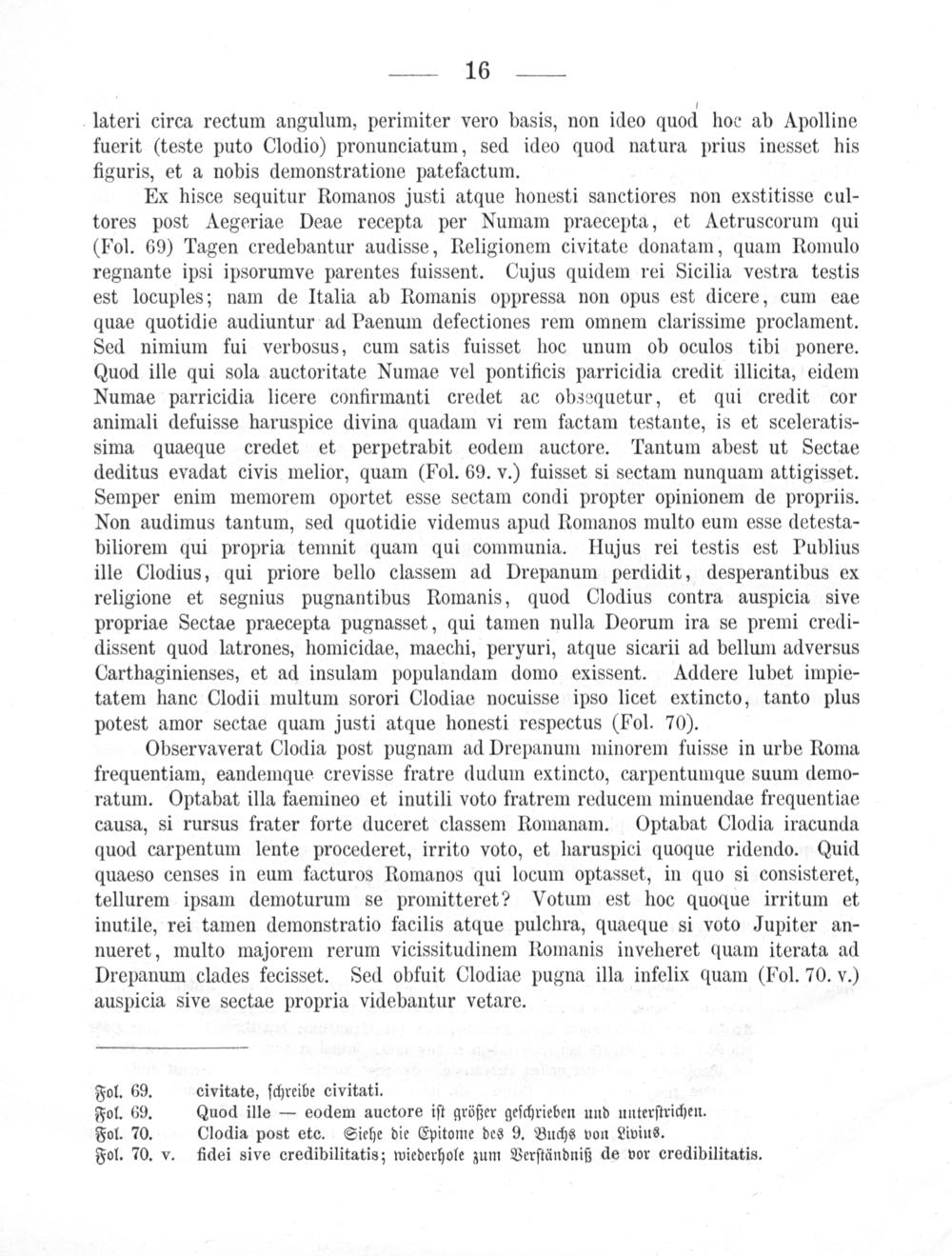 Observaverat Clodia post pugnam ad Drepanum minorem fuisse in urbe Roma frequentiam, eandemque crevisse fratre dudum extincto, carpentumque suum demo- ratum. Optabat illa faemineo et inutili voto fratrem reducem minuendae frequentiae causa, si rursus frater forte duceret classem Romanam. Optabat Clodia iracunda quod carpentum lente procederet, irrito voto, et haruspici quoque ridendo. Quid quaeso censes in eum facturos Romanos qui locum optasset, in quo si consisteret, tellurem ipsam demoturum se promitteret? Votum est hoc quoque irritum et inutile, rei tamen demonstratio facilis atque pulchra, quaeque si voto Jupiter an- nueret, multo majorem rerum vicissitudinem Romanis inveheret quam iterata ad Drepanum clades fecisset. Sed obfuit Clodiae pugna illa infelix quam(Fol. 70. v.) auspicia sive sectae propria videbantur vetare.