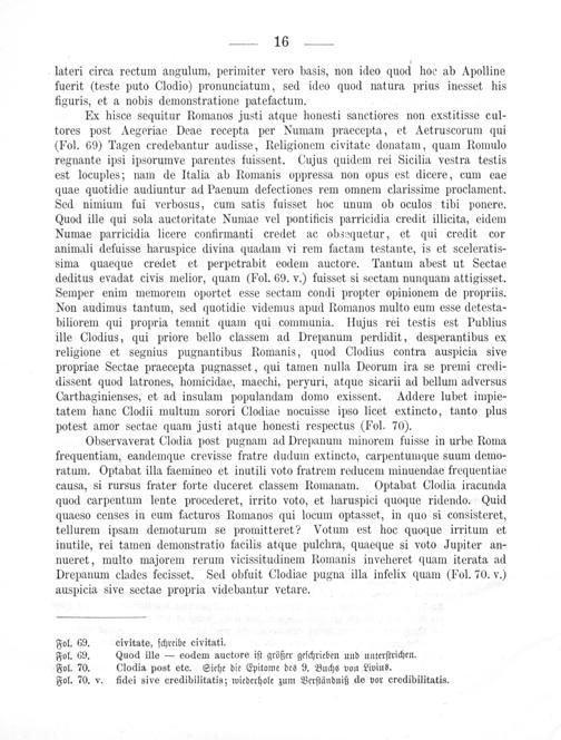 Ex hisce sequitur Romanos justi atque honesti sanctiores non exstitisse cul- tores post Aegeriae Deae recepta per Numam praecepta, et Aetruscorum qui (Fol. 69) Tagen credebantur audisse, Religionem civitate donatam, quam Romulo regnante ipsi ipsorumve parentes fuissent. Cujus quidem rei Sicilia vestra testis est locuples; nam de Italia ab Romanis oppressa non opus est dicere, cum eae quae quotidie audiuntur ad Paenum defectiones rem omnem clarissime proclament. Sed nimium fui verbosus, cum satis fuisset hoc unum ob oculos tibi ponere. Quod ille qui sola auctoritate Numae vel pontificis parricidia credit illicita, eidem Numae parricidia licere confirmanti credet ac obsequetur, et qui credit cor animali defuisse haruspice divina quadam vi rem factam testante, is et sceleratis- sima quaeque credet et perpetrabit eodem auctore. Tantum abest ut Sectae deditus evadat civis melior, quam(Fol. 69. v.) fuisset si sectam nunquam attigisset. Semper enim memorem coportet esse sectam condi propter opinionem de propriis. Non audimus tantum, sed quotidie videmus apud Romanos multo eum esse detesta- biliorem qui propria temnit quam qui communia. Hujus rei testis est Publius ille Clodius, qui priore bello classem ad Drepanum perdidit, desperantibus ex religione et segnius pugnantibus Romanis, quod Clodius contra auspicia sive propriae Sectae praecepta pugnasset, qui tamen nulla Deorum ira se premi credi- dissent quod latrones, homicidae, maechi, peryuri, atque sicarii ad bellum adversus Carthaginienses, et ad insulam populandam domo exissent. Addere lubet impie- tatem hanc Clodii multum sorori Clodiae nocuisse ipso licet extincto, tanto plus potest amor sectae quam justi atque honesti respectus(Fol. 70).