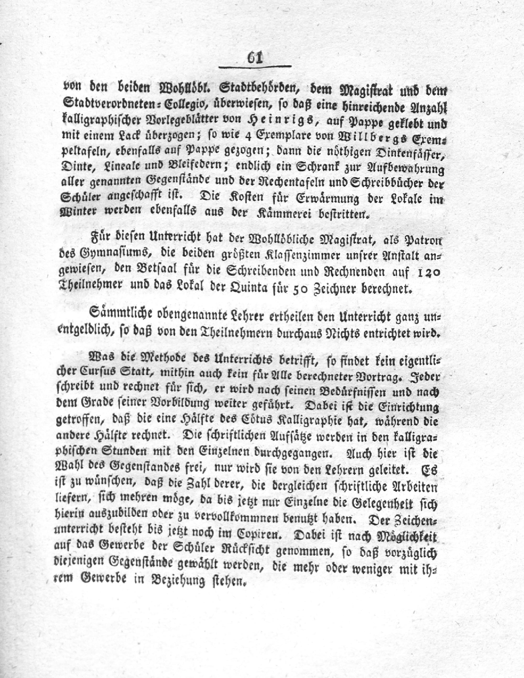 Fuͤr dieſen Unterricht hat der Wohlloͤbliche Magiſtrat, als Patron des Gymnaſiums, die beiden groͤßten Klaſſenzimmer unſrer Anſtalt an⸗ gewieſen, den Betſaal fuͤr die Schreibenden und Rechnenden auf 120 Theilnehmer und das Lokal der Quinta fuͤr 50 Zeichner berechnet.