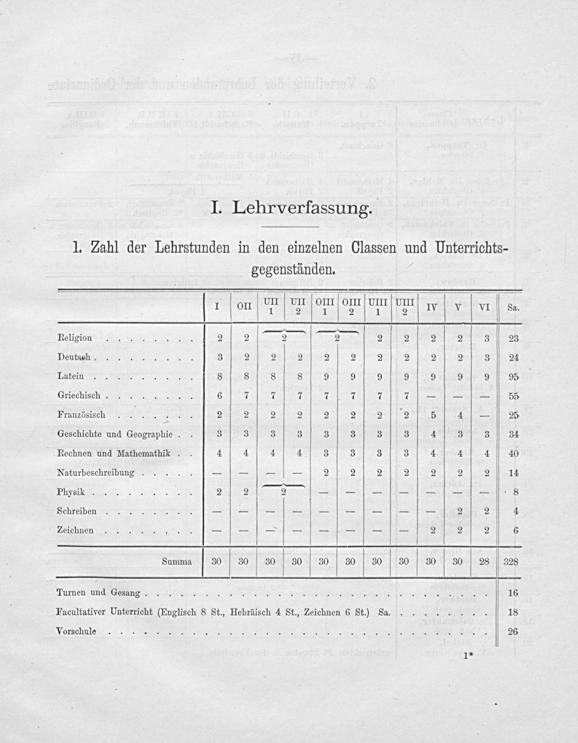 1. Zahl der Lehrstunden in den einzelnen Classen und Unterrichts-