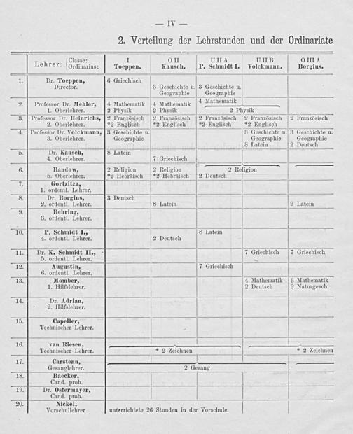 Lehrer: Classe: I 0II UIIA UII B 0 III A ehrer:[Ordinarius: Toeppen. Kausch. P. Schmidt I. Volckmann. Borgius. 1. Dr. Toeppen, 6 Griechisch Director. 3 Geschichte u. 3 Geschichte u. Geographie Geographie 2. Professor Dr. Mehler, 4 Mathematik 4 Mathematik 4 Mathematik 1. Oberlehrer. 2 Physik 2 Physik 2 Physik 3. Professor Dr. Heinrichs, 2 Französisch 2 Französisch 2 Französisch 2 Französisch 2 Französisch 2. Oberlehrer.*2 Englisch*2 Englisch*2 Englisch*2 Englisch 4. Professor Dr. Volckmann, 3 Geschichte u. 3 Geschichte u. 3 Geschichte u. 3. Oberlehrer. Geographie Geographie Geographie 8 Latein 2 Deutsch 5. Dr. Kausch, 8 Latein 4. Oberlehrer. 7 Griechisch 6. Bandow, 2 Religion 2 Religion 2 Religion 5. Oberlehrer.*2 Hebräisch*2 Hebräisch 2 Deutsch 7. Gortzitza, 1. ordentl. Lehrer. 8. Dr. Borgius, 3 Deutsch 2. ordentl. Lehrer. 8 Latein 9 Latein 9. Behring, 3. ordentl. Lehrer. 10. P. Schmidt I., 8 TLatein 4. ordentl. Lehrer. 2 Deutsch 11. Dr. K. Schmidt II., 7 Griechisch 7 Griechisch 5. ordentl. Lehrer.— 12. Augustin, 7 Griechisch 6. ordentl. Lehrer. 13. Momber, 4 Mathematik 3 Mathematik 1. Hilfslehrer. 2 Deutsch 2 Naturgesch. 14. Dr. Adrian, 2. Hilfslehrer. 15. Capeller, Technischer Lehrer. 16. van Riesen, Technischer Lehrer.* 2 Leichnen* 2 ZLeichnen 17. Carstenn, Gesanglehrer. 2 Gesang 18. Baecker, Cand. prob. 19. Dr. Ostermayer, Cand. prob. 20. Nickel, Vorschullehrer unterrichtete 26 Stunden in der Vorschule.