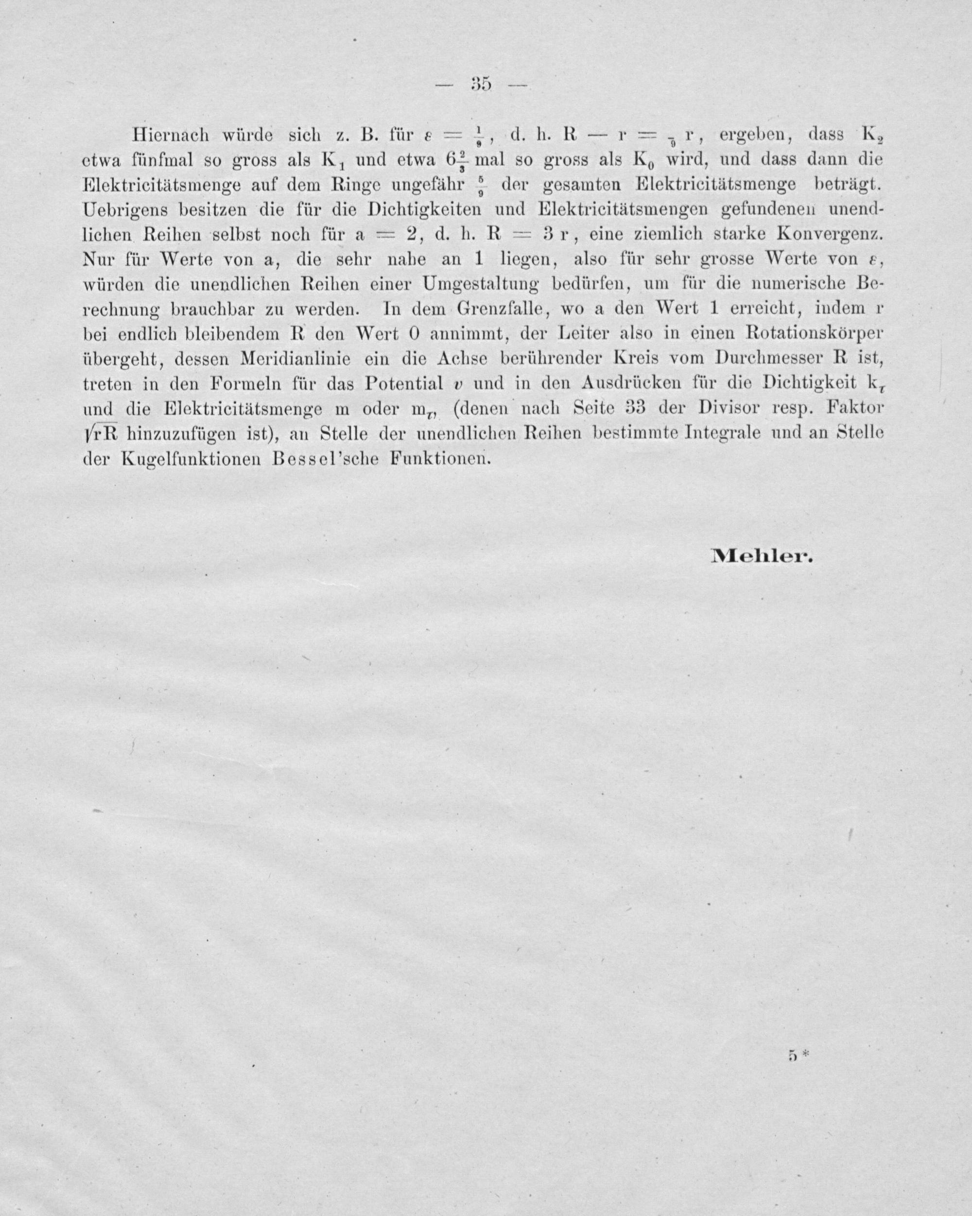 etwa fünfmal so gross als K. und etwa 6 ⅓ mal so gross als Ko wird, und dass dann die Elektricitätsmenge auf dem Ringe ungefähr der gesamten Elektricitätsmenge beträgt. Uebrigens besitzen die für die Dichtigkeiten und Elektricitätsmengen gefundenen unend- lichen Reihen selbst noch für a= 2, d. h. R= 31, eine ziemlich starke Konvergenz. Nur für Werte von a, die sehr nabe an 1 liegen, also für sehr grosse Werte von è, würden die unendlichen Reihen einer Umgestaltung bedürfen, um für die numerische Be- rechnung brauchbar zu werden. In dem Grenzfalle, wo a den Wert 1 erreicht, indem r bei endlich bleibendem R den Wert O annimmt, der Leiter also in einen Rotationskörper übergeht, dessen Meridianlinie ein die Achse berührender Kreis vom Durchmesser R ist, treten in den Formeln für das Potential» und in den Ausdrücken für die Dichtigkeit k, und die Elektricitätsmenge m oder m,(denen nach Seite 33 der Divisor resp. Faktor rR hinzuzufügen ist), an Stelle der unendlichen Reihen bestimmte Integrale und an Stelle der Kugelfunktionen Bessel'sche Funktionen.