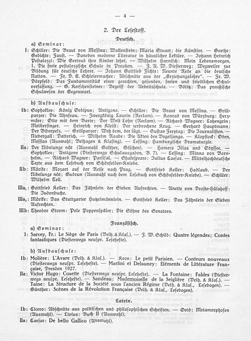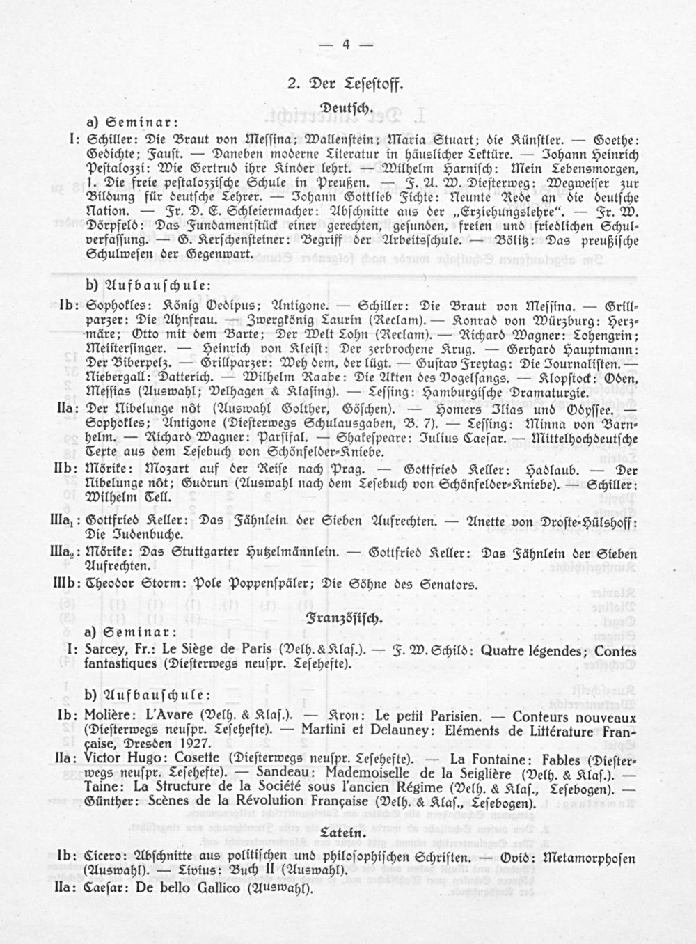 Meiſterſinger.— Heinrich von Kleiſt: Der zerbrochene Krug.— Gerhard Hauptmann: Der Biberpelz.— Grillparzer: Weh dem, der lügt.— Guſtav Freytag: Die Journaliſten.— Niebergall: Datterich.— Wilhelm Raabe: Die Akten des Vogelſangs.— Klopſtock: Oden, Meſſias(Auswahl; Velhagen& Klaſing).— Leſſing: Hamburgiſche Dramaturgie.