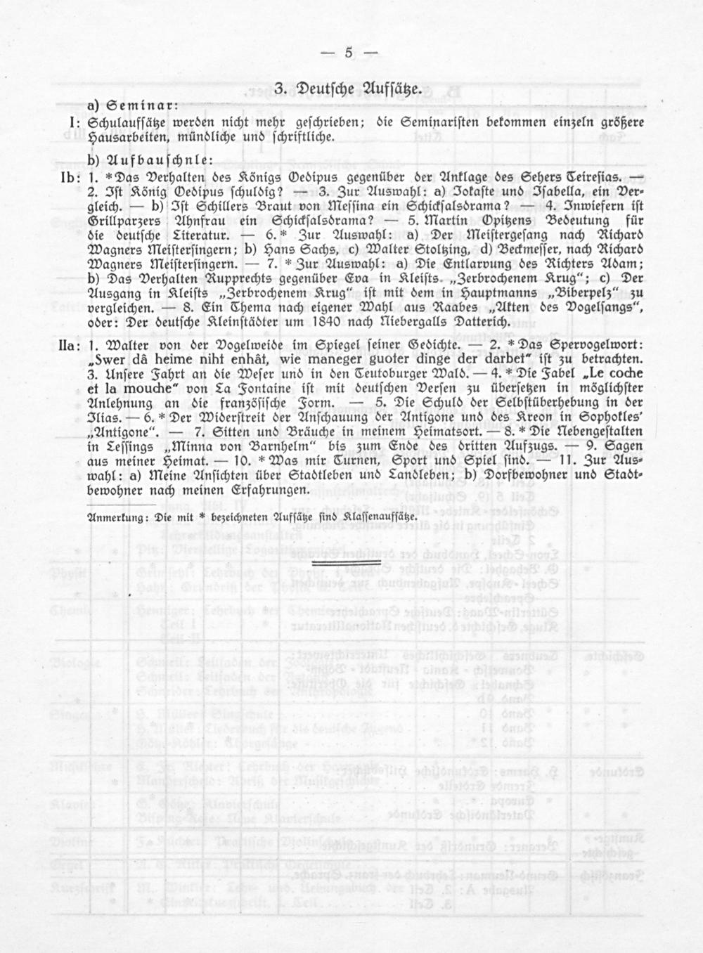 1.*Das Verhalten des Königs Oedipus gegenüber der Anklage des Sehers Teireſias.— 2. Iſt König Oedipus ſchuldig?— 3. Zur Auswahl: a) Jokaſte und Iſabella, ein Ver⸗ gleich.— b) Iſt Schillers Braut von Meſſina ein Schickſalsdrama?— 4. Inwiefern iſt Grillparzers Ahnfrau ein Schickſalsédrama?— 5. Martin Opitzens Bedeutung für die deutſche Titeratur.— 6.* Zur Auswahl: a) Der Neiſtergeſang nach Richard Wagners Meiſterſingern; b) Hans Sachs, c) Walter Stoltzing, d) Beckmeſſer, nach Richard Wagners Neiſterſingern.— 7.* Zur Auswahl: a) Die Entlarvung des Richters Adam; b) Das Verhalten Rupprechts gegenüber Eva in Kleiſts.„Zerbrochenem Krug“; c) Der Ausgang in Kleiſts„Zerbrochenem Krug“ iſt mit dem in Hauptmanns„Biberpelz“ zu vergleichen.— 8. Ein Thema nach eigener Wahl aus Raabes„Akten des Vogelſangs“, oder: Der deutſche Kleinſtädter um 1840 nach KNiebergalls Datterich.