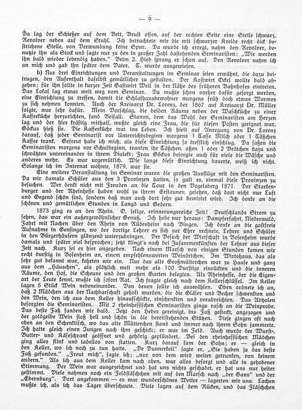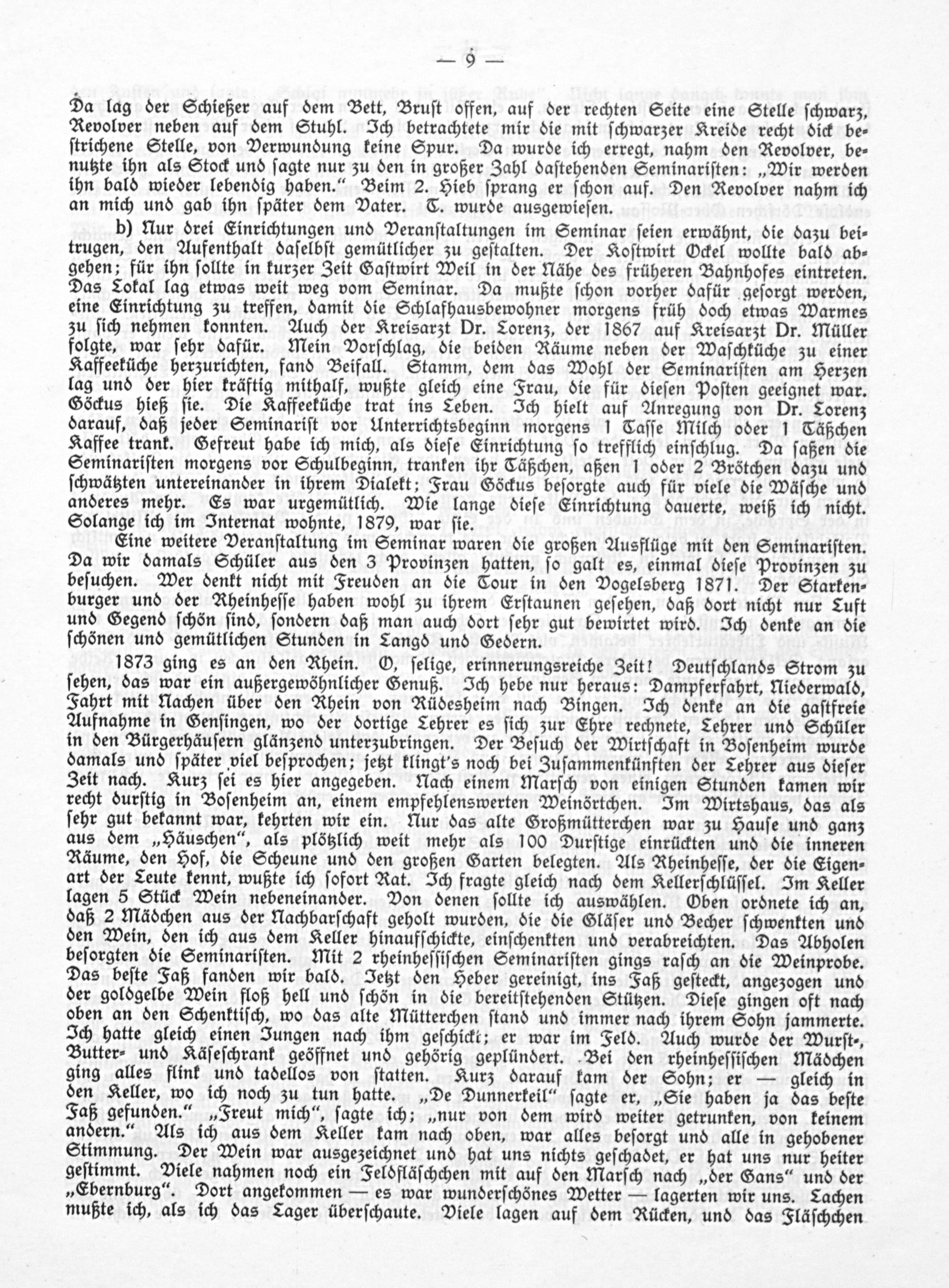Eine weitere Veranſtaltung im Seminar waren die großen Ausflüge mit den Seminariſten. Da wir damals Schüler aus den 3 Provinzen hatten, ſo galt es, einmal dieſe Provinzen zu beſuchen. Wer denkt nicht mit Freuden an die Cour in den Vogelsberg 1871. Der Starken⸗ burger und der Rheinheſſe haben wohl zu ihrem Erſtaunen geſehen, daß dort nicht nur Luft und Gegend ſchön ſind, ſondern daß man auch dort ſehr gut bewirtet wird. Ich denke an die ſchönen und gemütlichen Stunden in Tangé und Gedern.