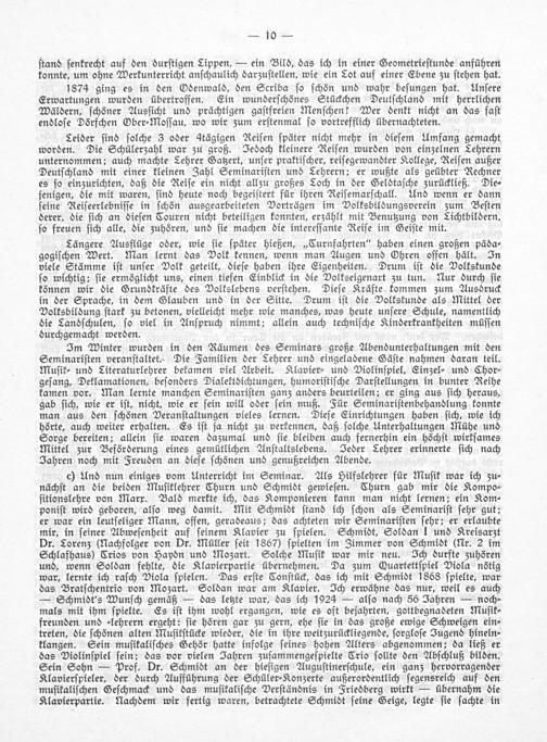 Leider ſind ſolche 3 oder 4tägigen Reiſen ſpäter nicht mehr in dieſem Umfang gemacht worden. Die Schülerzahl war zu groß. Jedoch kleinere Reiſen wurden von einzelnen Lehrern unternommen; auch machte Tehrer Gatzert, unſer praktiſcher, reiſegewandter Kollege, Reiſen außer Deutſchland mit einer kleinen Zahl Seminariſten und Lehrern; er wußte als geübter Rechner es ſo einzurichten, daß die Reiſe ein nicht allzu großes Toch in der Geldtaſche zurückließ. Die⸗ jenigen, die mit waren, ſind heute noch begeiſtert für ihren Reiſemarſchall. Und wenn er dann ſeine Reiſeerlebniſſe in ſchön ausgearbeiteten Vorträgen im Volksbildungsverein zum Beſten derer, die ſich an dieſen Couren nicht beteiligen konnten, erzählt mit Benutzung von Lichtbildern, ſo freuen ſich alle, die zuhören, und ſie machen die intereſſante Reiſe im Geiſte mit.