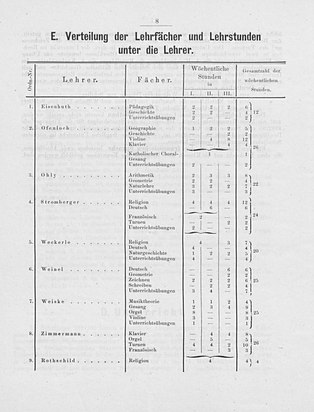> Gesamtzahl der D A Y& R L ehr eT, Fächer. Stunden wöchentlichen E=]- in (=) Stunden. I 11... 10 1.] Eisenhuth Pädagogik 2 2 2 6) Geschichte 2 2—_ 4 12 Unterrichtsübungen 2-. 2} 2.1 Ofenloch Geographie 1 2 2 5] Geschichte-= 2 2 Violine a 4 8 15| Klavier—== 4 410g u En TE" er Katholischer Choral- A 1 Gesang Unterriehtsübungen 2—— 2 J 3.] Ohly Arithmetik 2 3 3 8 Geometrie 2 2 vs£} 29 Naturlehre 3 2 2 T ee Unterriehtsübungen 3- u 37 4.| Stromberger Religion 4 4 4 12! Deutsch_ 6_ 6| ———© Französisch 2— 21° Turnen=— 2 2| Unterrichtsübungen i u= 2 J De zu nn Be 5.] Weckerle Religion 4 3 7} Deutsch 4—_ 41 20 Naturgeschichte 1 2 2 5 Unterrichtsübungen 4 Ai 2 61 Weınel..., Deutsch= 6> Geometrie= u PD) 92 Zeichnen 2 2 2 6 325 Schreiben= 2 2 4| Unterrichtsübungen 3 4= T, 7.]| Weiske Musiktheorie 1 1 2 4 Gesang 2 3 4 9 Orgel 8—— 8 325 Violine 3 är“ 5 Unterrichtsübungen 1=_ 1 8] Zimmermann. Klavier— 4 4 8, Orgel— 5 5 Iog Turnen 4 4 2 10 7 Französisch——_ 3 3| 9%] Rothschild:.:, Religion 4# 4