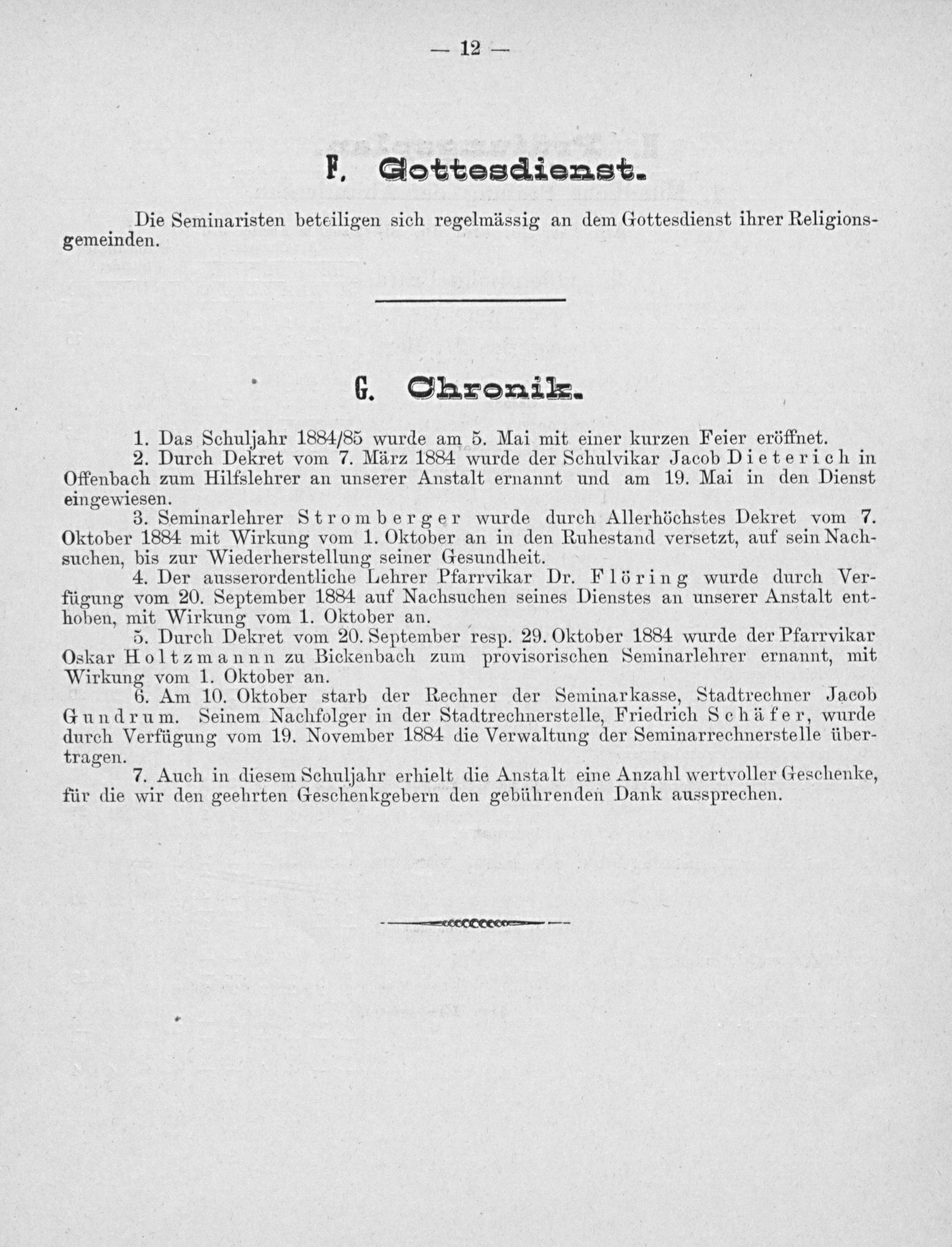 5. Durch Dekret vom 20. September resp. 29. Oktober 1884 wurde der Pfarrvikar Oskar Holtzmannn zu Bickenbach zum provisorischen Seminarlehrer ernannt, mit Wirkung vom 1. Oktober an.