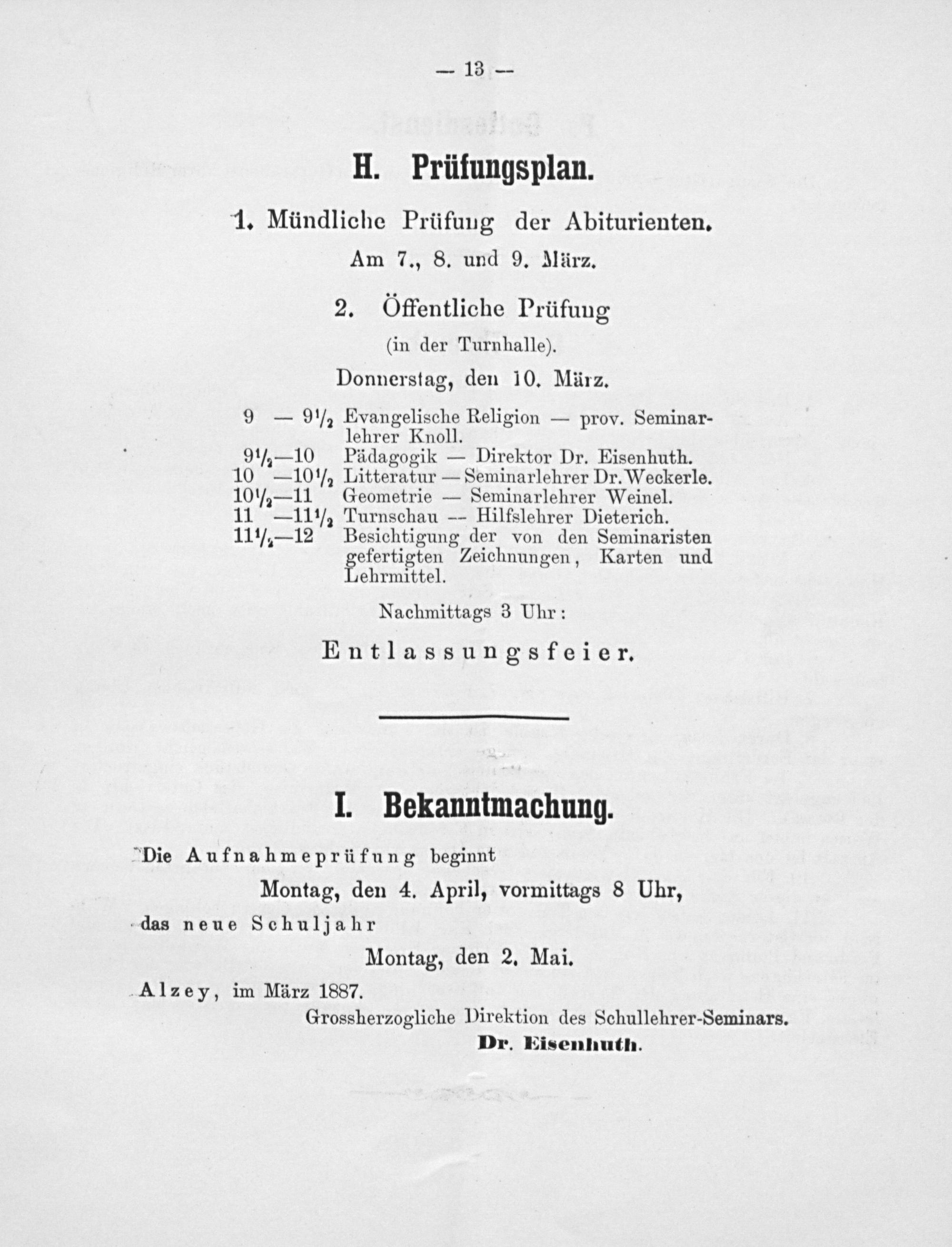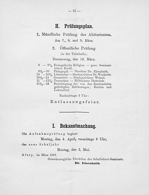 ‚Alzey, im März 1837. Grossherzogliche Direktion des Schullehrer-Seminars. Dr. Eisenhuth.