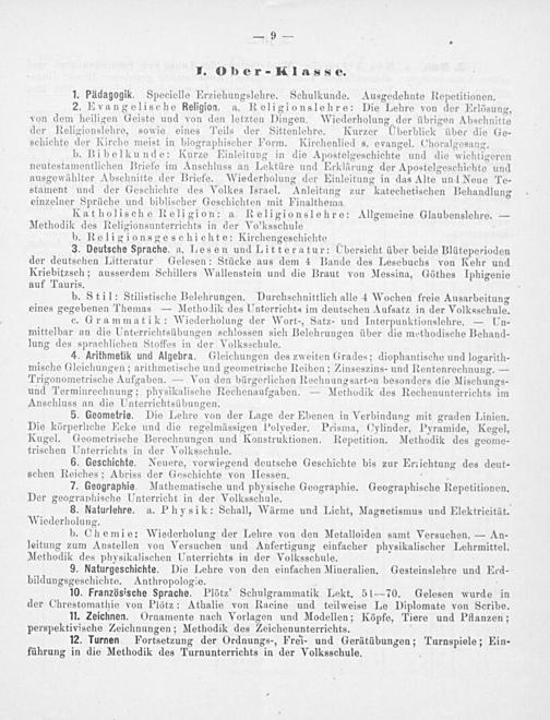 3. Deutsche Sprache. a. Lesen und Litteratur: Übersicht über beide Blüteperioden der deutschen Litteratur Gelesen: Stücke aus dem 4 Bande des Lesebuchs von Kehr und Kriebitzsch; ausserdem Schillers Wallenstein und die Braut von Messina, Göthes Iphigenie auf Tauris.