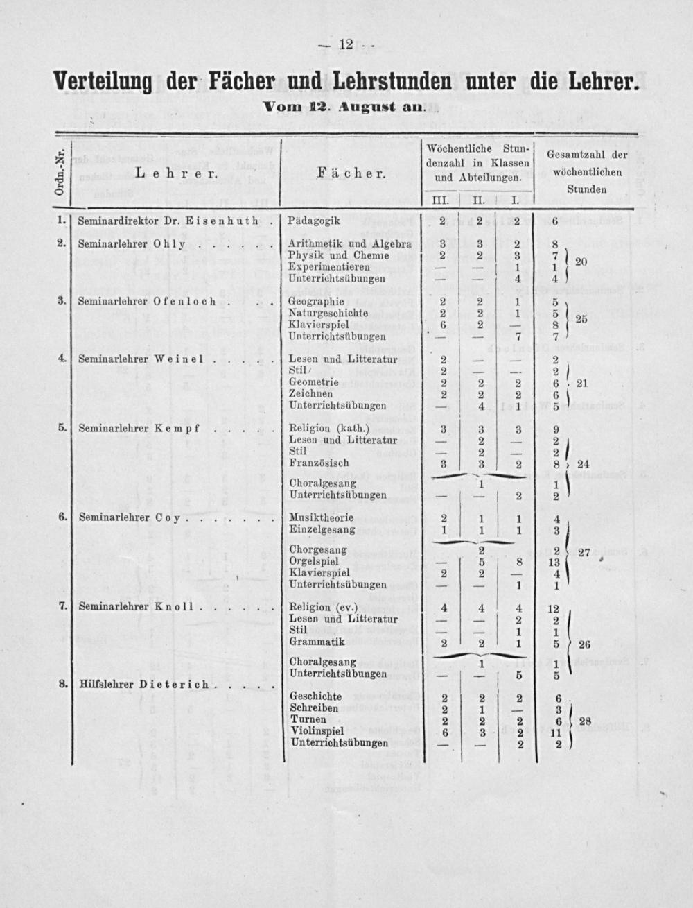Verteilung der Fächer und Lehrstunden unter die Lehrer.
