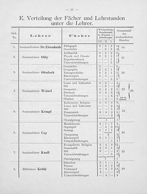 Wöchentliche. Ord.- Stundenzahl een :.“ 2 s in Klassen u. i No. Denzet Macher Abteilungen| wöchentlichen mL Stunden 1.|Seminardirektor Dr.Eisenhuth| F*lagogik 2721 211.000 Ir Geschichte—|2/2]|4 Arithmetik anne eTere= 9, Neninsrichrer Ohly Physik und Chemie 212:7314 1 Experimentieren—|—/1[|1 a“ Unterrichtsübungen—/—|5[|5 Geschichte ae 34-4127 3 > Geographie 2,241 115 3. Seminarlehrer Ofenloch Naturgeschichte 2121115) 24 Klavierspiel 413|—]|7 Ba Z Unterriehtsübungen— 1— 1515’ Lesen und Litteratur 2479 1-14} Stil—|2|—]|2| a E‘€>‘ 4, Seminarlehrer Weinel Eh. 2 2 ec s Ba A0g Zeichnen 232,216 Unterrichtsübungen—|—!/4]4 =&[Obstbau 0000.18.|—| 3 sommer Katholische Religion 31.8°,.3:139 Lesen und Litteratur—|—-|2]|2 = Ss- Stil Bea 3 = Seminarlehrer Kempf Französisch 22932 2138 ar Unterrichtsübungen ie] 212 un[en Choralgesang 1 4, ne Musiktheorie 2 I 1 ı 114 Orgelspiel—!51|8[113 e AR> Gesang i:111]|3 or . Se i le Nas zmmau- 26 ) Seminarlehrer Coy Chorgesang_ B) 2> Klavierspiel 2|11|1—-|3 Unterrichtsübungen—/—|1J1 fe Evangelische Religion 4/4|4[12 Grammatik 2:2| 115 ee r Stil 2/—-/—12) 2 %\}= 5 bei Unterrichtsübungen—|j—1[5|[|5 un Choralgesang LnsshAsze ® Schreiben 2|1|1—1|3 Turnen 2121216 8. Hilfslehrer Kröhl Violinspiel 813131147 29 Klavierspiel 2I1—|—|2 Unterrichtsübungen—/4|—]4