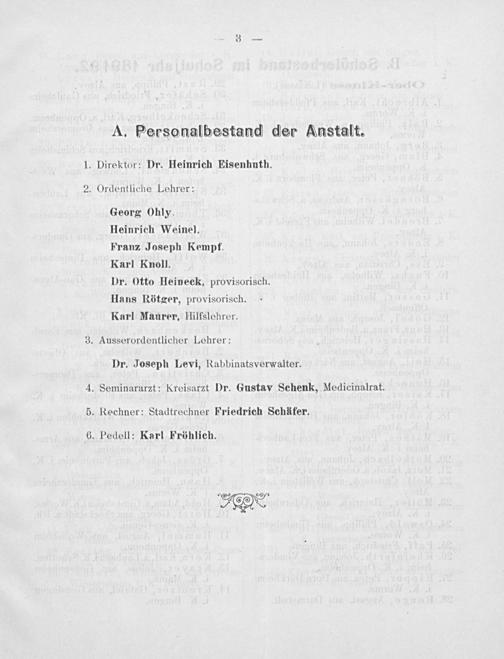 Dr. Joseph Levi, Rabbinatsverwalter. 4. Seminararzt: Kreisarzt Dr. Gustav Schenk, Medicinalrat. 5. Rechner: Stadtrechner Friedrich Schäfer,