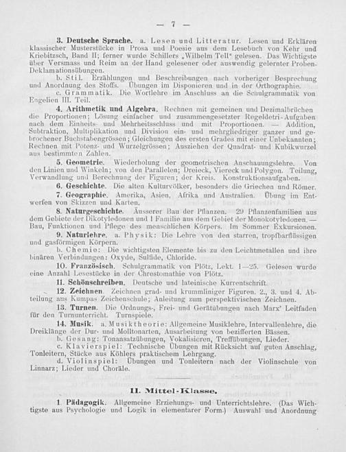 d. Violinspiel: Übungen und Tonleitern nach der Violinschule von Linnarz; Lieder und Choräle.
