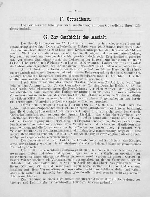 Das Schuljahr begann am 22. April v. Js.; auch es hat wieder eine Personal- veränderung gebracht. Durch Allerhöchstes Dekret vom 29. Februar 1896 wurde der Gr. Seminarlehrer Heinrich Mathes zum Kreisschulinspector des Kreises Alsfeld er- nannt. Mit ihm verlor die Anstalt einen treuen, fleissigen und gewissenhaften Lehrer, der, wenn er auch nur wenige Jahre hier gewirkt, doch recht Erspriessliches geleistet hat. Zu seinem Nachfolger wurde der Lehr er an der höheren Mädchenschule zu Mainz Jakob Dieterich mit Wirkung vom 1. April 1896 ernannt. Dadurch wurde der Anstalt ein Lehrer wiedergegeben, der ihr schon von 1884—1890 als Hilfslehrer angehört hatte,