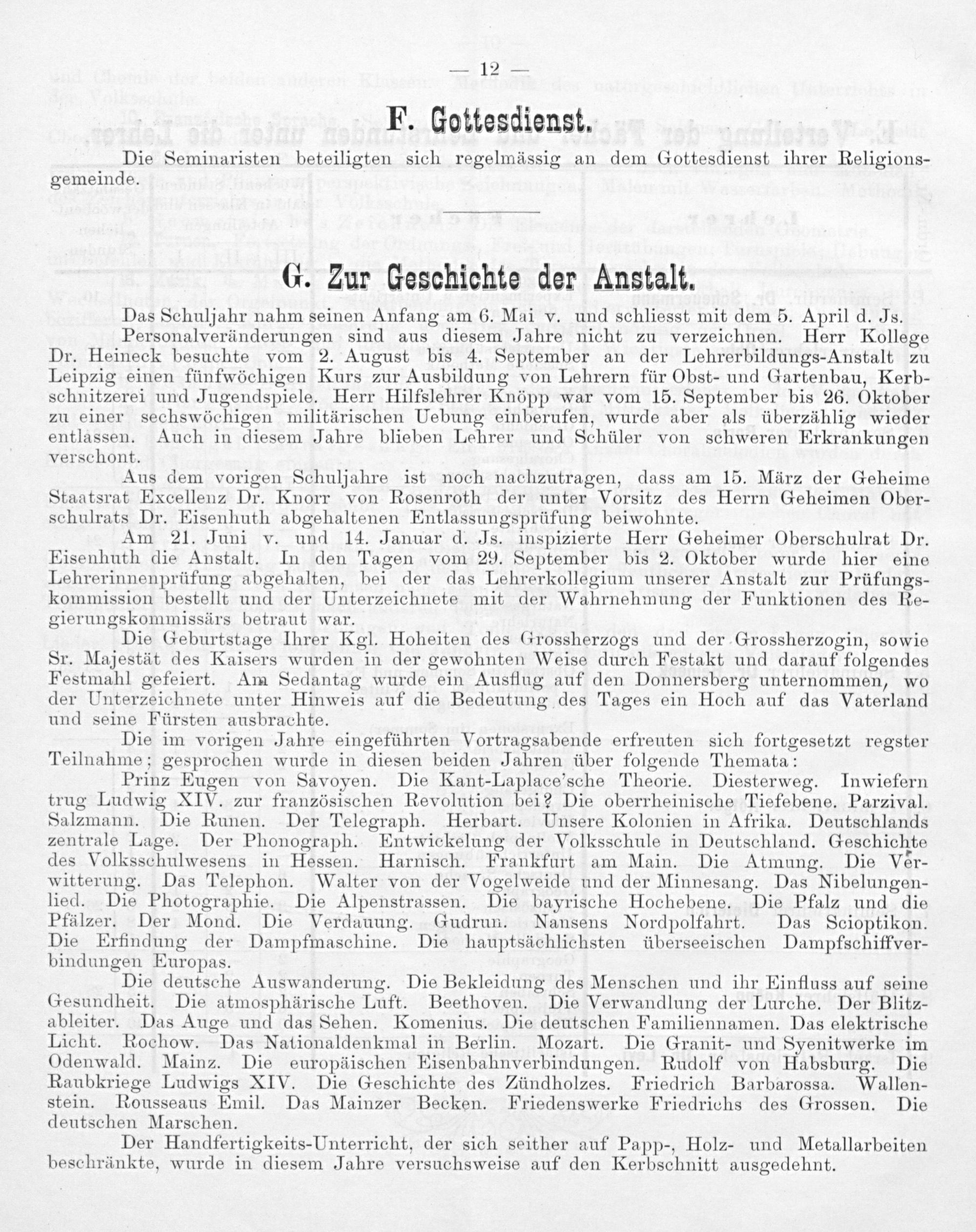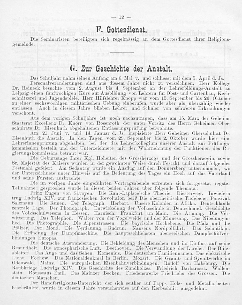 Prinz Eugen von Savoyen. Die Kant-Laplace’sche Theorie. Diesterweg. Inwiefern trug Ludwig XIV. zur französischen Revolution bei? Die oberrheinische Tiefebene, Parzival. Salzmann. Die Runen. Der Telegraph. Herbart. Unsere Kolonien in Afrika. Deutschlands zentrale Lage. Der Phonograph. Entwickelung der Volksschule in Deutschland. Geschichte des Volksschulwesens in Hessen. Harnisch. Frankfurt am Main. Die Atmung. Die Ver- witterung. Das Telephon. Walter von der Vogelweide und der Minnesang. Das Nibelungen- lied. Die Photographie. Die Alpenstrassen. Die bayrische Hochebene. Die Pfalz und die Pfälzer. Der Mond. Die Verdauung. Gudrun. Nansens Nordpolfahrt. Das Scioptikon. Die Erfindung der Dampfmaschine. Die hauptsächlichsten überseeischen Dampfschiffver- bindungen Europas.