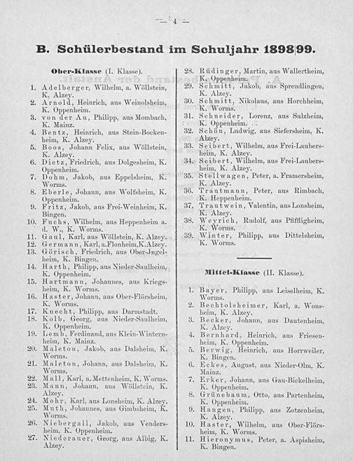 Bayer, Philipp, aus Leiselheim, K. Worms. Bechtolsheimer, heim, K. Alzey. Becker, Johann, aus Dautenheim, K. Alzey.