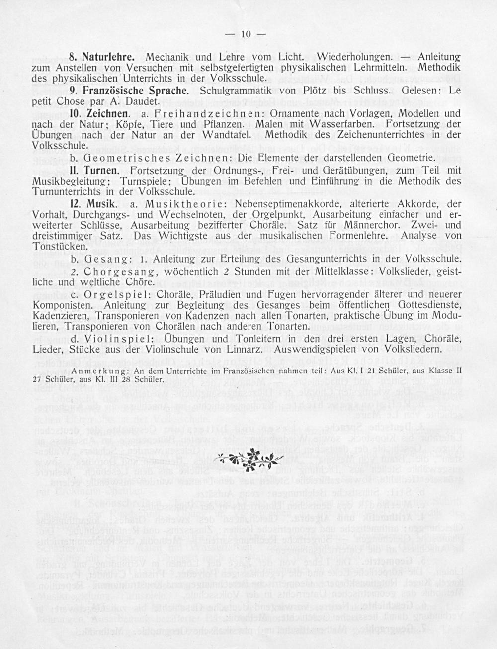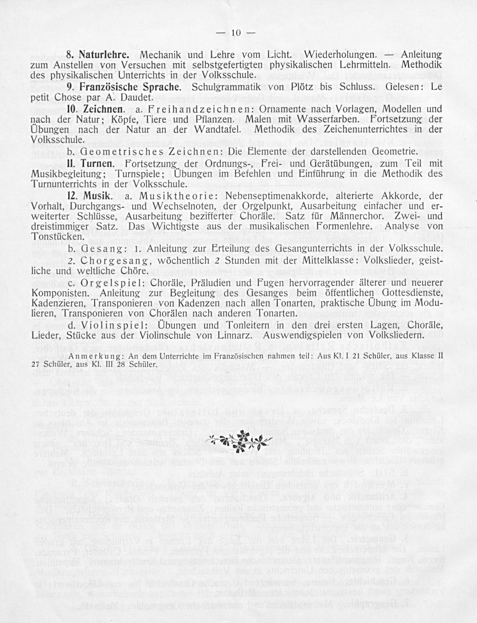 10. Zeichnen. a. Freihandzeichnen: Ornamente nach Vorlagen, Modellen und nach der Natur; Köpfe, Tiere und Pflanzen. Malen mit Wasserfarben. Fortsetzung der Übungen nach der Natur an der Wandtafel. Methodik des Zeichenunterrichtes in der Volksschule.