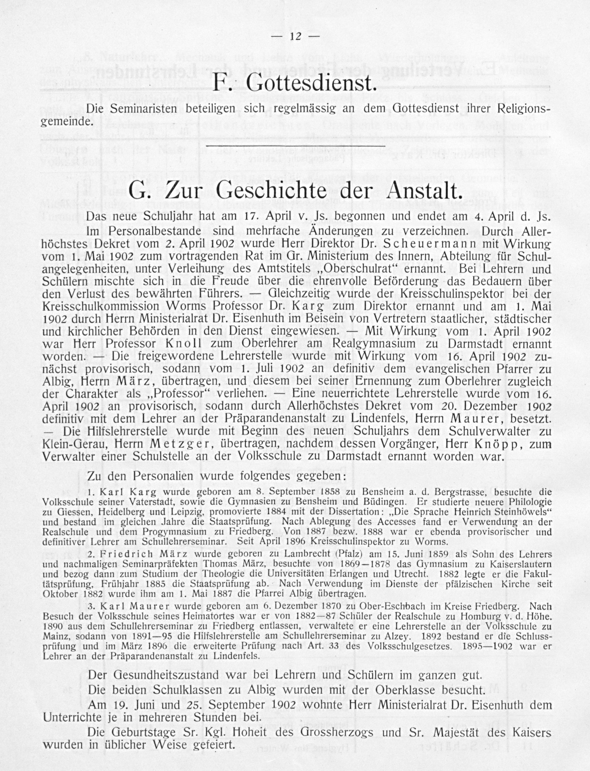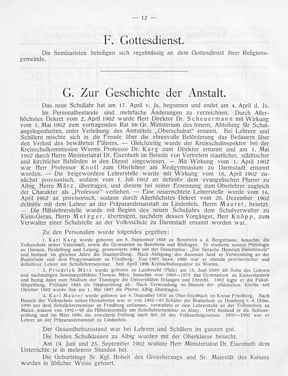 Im Personalbestande sind mehrfache Änderungen zu verzeichnen. Durch Aller- höchstes Dekret vom 2. April 1902 wurde Herr Direktor Dr. Scheuermann mit Wirkung vom 1. Mai 1902 zum vortragenden Rat im Gr. Ministerium des Innern, Abteilung für Schul- angelegenheiten, unter Verleihung des Amtstitels„Oberschulrat“ ernannt. Bei Lehrern und Schülern mischte sich in die Freude über die ehrenvolle Beförderung das Bedauern über den Verlust des bewährten Führers.— Gleichzeitig wurde der Kreisschulinspektor bei der Kreisschulkommission Worms Professor Dr. Karg zum Direktor ernannt und am 1. Mai 1902 durch Herrn Ministerialrat Dr. Eisenhuth im Beisein von Vertretern staatlicher, städtischer und kirchlicher Behörden in den Dienst eingewiesen.— Mit Wirkung vom 1. April 1902 war Herr Professor Knoll zum Oberlehrer am Realgymnasium zu Darmstadt ernannt worden.— Die freigewordene Lehrerstelle wurde mit Wirkung vom 16. April 1902 zu- nächst provisorisch, sodann vom 1. Juli 1902 an definitiv dem evangelischen Pfarrer zu Albig, Herrn März, übertragen, und diesem bei seiner Ernennung zum Oberlehrer zugleich der Charakter als ‚Professor‘ verliehen.— Eine neuerrichtete Lehrerstelle wurde vom 16. April 1902 an provisorisch, sodann durch Allerhöchstes Dekret vom 20. Dezember 1902 definitiv mit dem Lehrer an der Präparandenanstalt zu Lindenfels, Herrn Maurer, besetzt. — Die Hilfslehrerstelle wurde mit Beginn des neuen Schuljahrs dem Schulverwalter zu Klein-Gerau, Herrn Metzger, übertragen, nachdem dessen Vorgänger, Herr Knöpp, zum Verwalter einer Schulstelle an der Volksschule zu Darmstadt ernannt worden war.