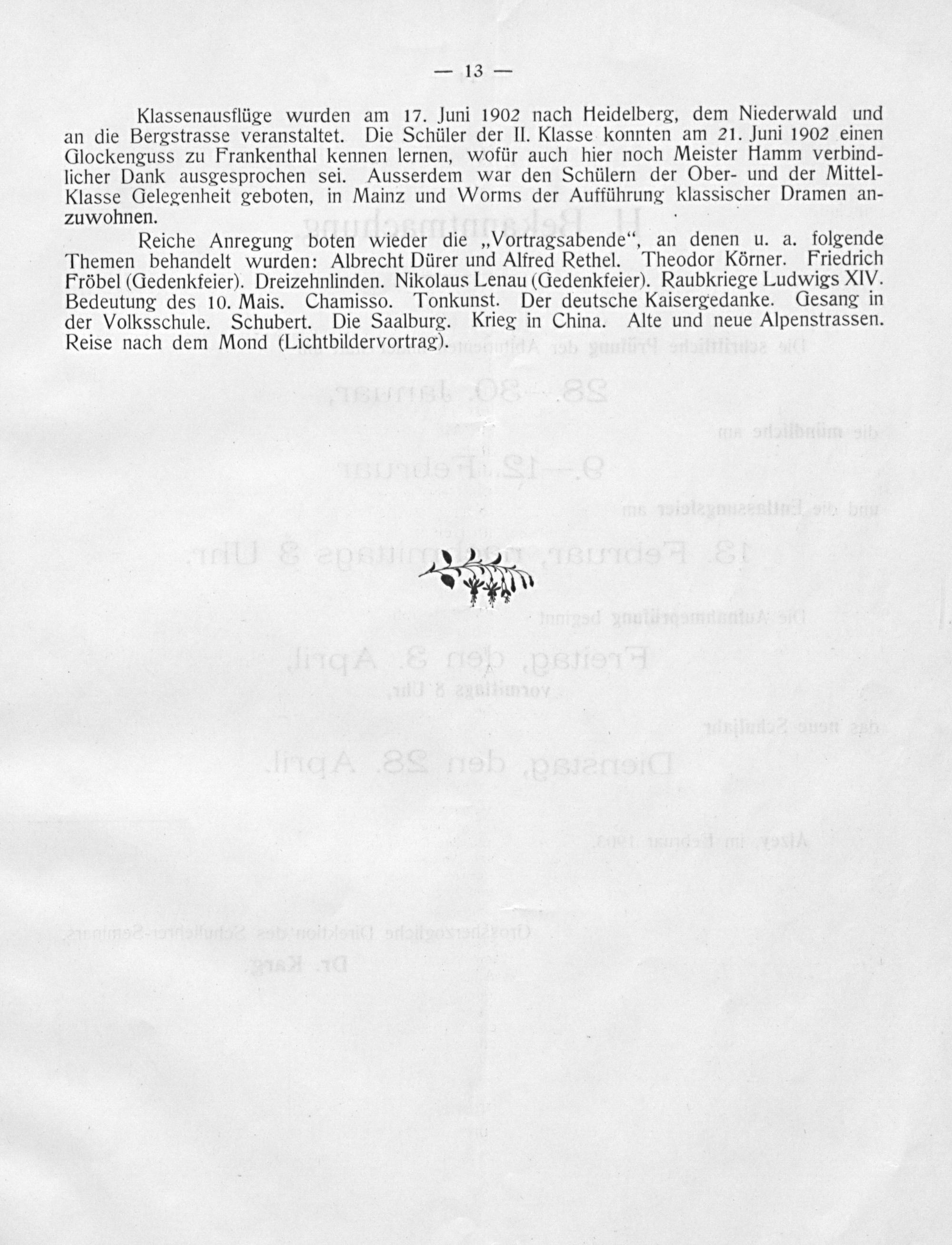 Klassenausflüge wurden am 17. Juni 1902 nach Heidelberg, dem Niederwald und an die Bergstrasse veranstaltet. Die Schüler der Il. Klasse konnten am 21. Juni 1902 einen Glockenguss zu Frankenthal kennen lernen, wofür auch hier noch Meister Hamm verbind- licher Dank ausgesprochen sei. Ausserdem war den Schülern der Ober- und der Mittel- Klasse Gelegenheit geboten, in Mainz und Worms der Aufführung klassischer Dramen an- zuwohnen..: