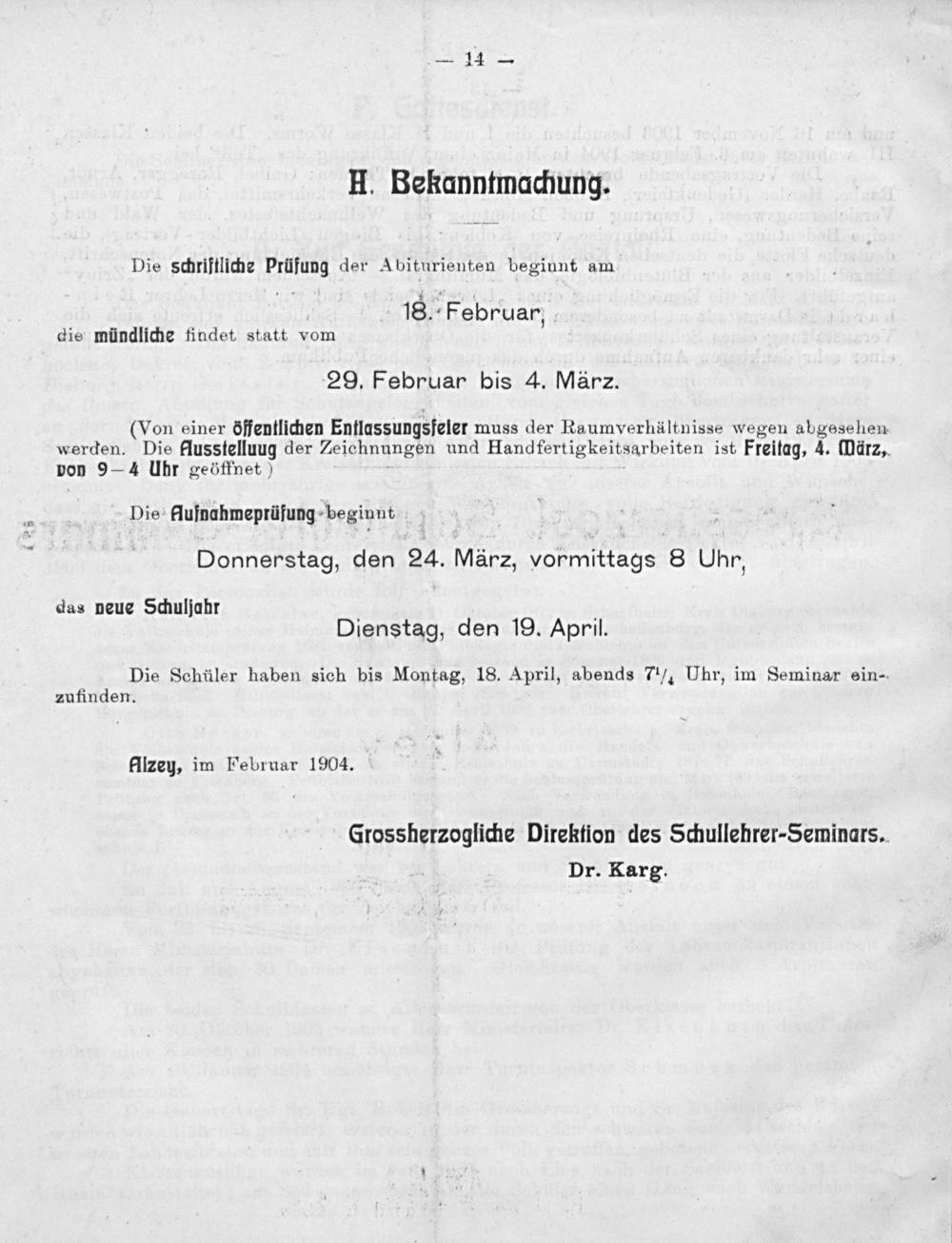 Grossherzoglidhe Direktion des Schullehrer-Seminars.. Dr. Karg.