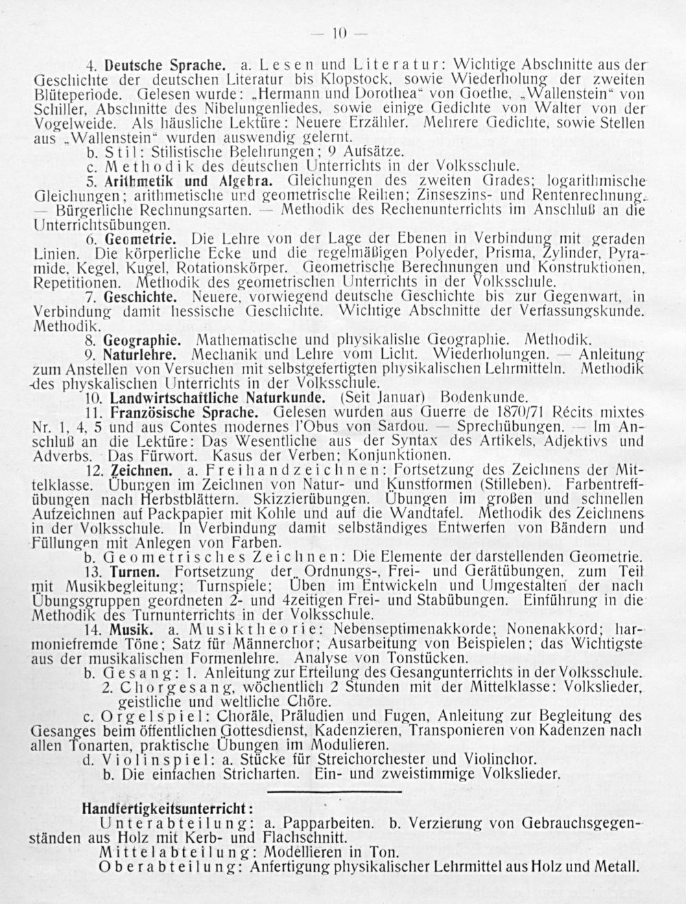 Handiertigkeitsunterricht::> Unterabteilung: a. Papparbeiten. b. Verzierung von Gebrauchsgegen- ständen aus Holz mit Kerb- und Flachschnitt. Mittelabteilung: Modellieren in Ton. Oberabteilung: Anfertigung physikalischer Lehrmittel aus Holz und Metall.