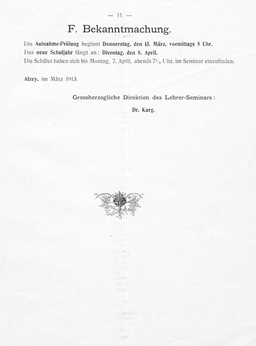Die Aufnahme-Prüfung beginnt Donnerstag, den 13. März, vormittags 8 Uhr. Das neue Schuljahr fängt an: Dienstag, den 8. April. Die Schüler haben sich bis Montag, 7. April, abends 7'/, Uhr, im Seminar einzufinden.