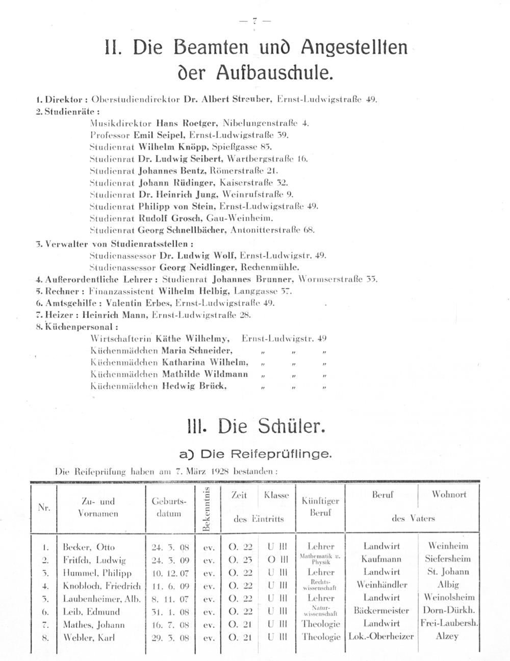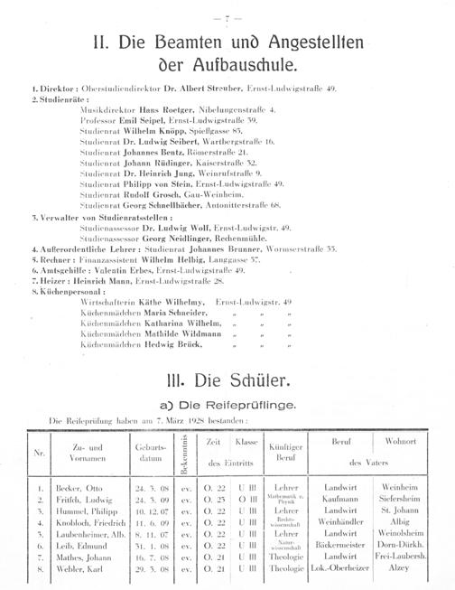 Studienrat Dr. Heinrich Jung, Weinrufstraße 9. Studienrat Philipp von Stein, Ernst-Ludwigstraße 49. Studienrat Rudolf Grosch, Gau-Weinheim. Studienrat Georg Schnellbächer, Antonitterstraße 68.