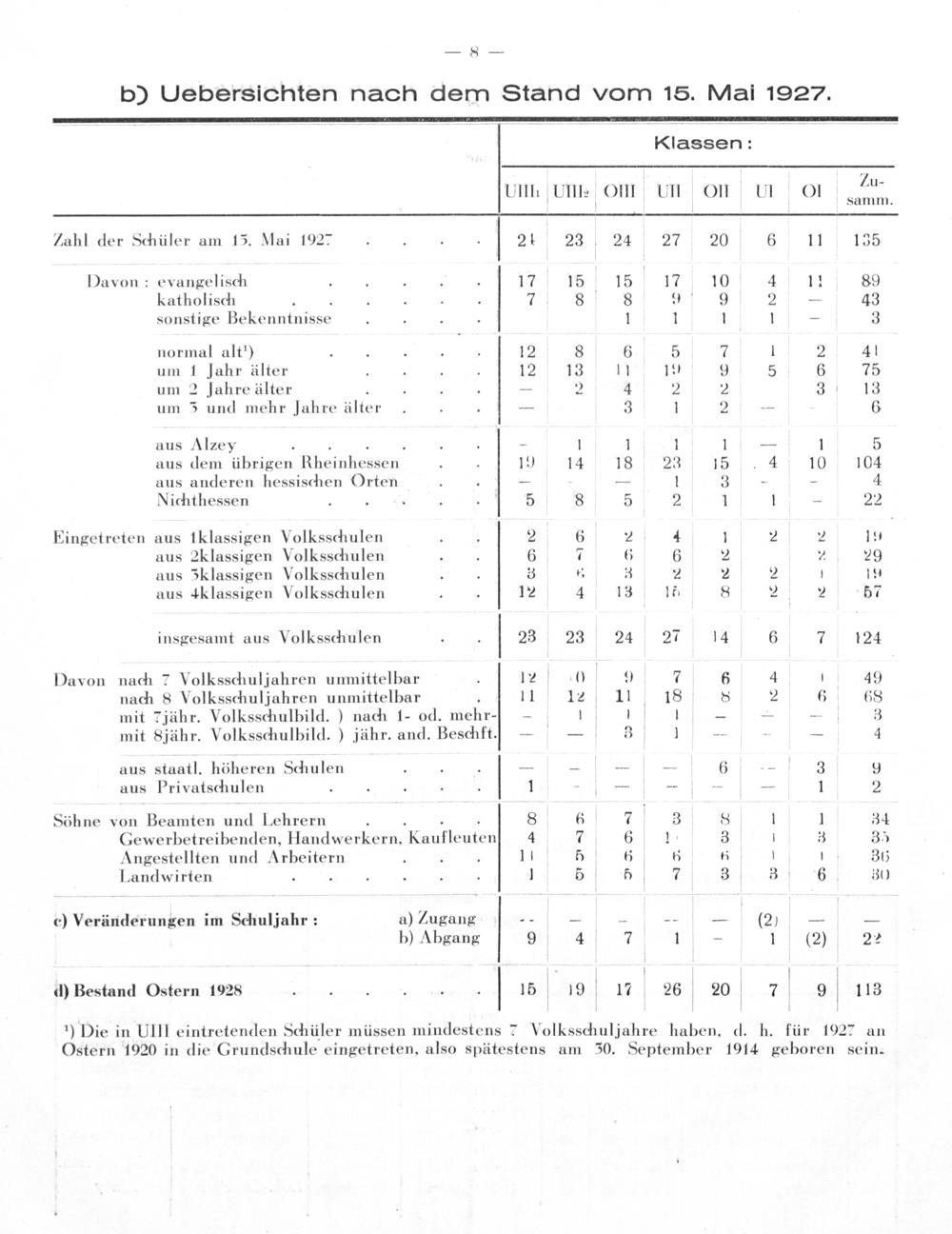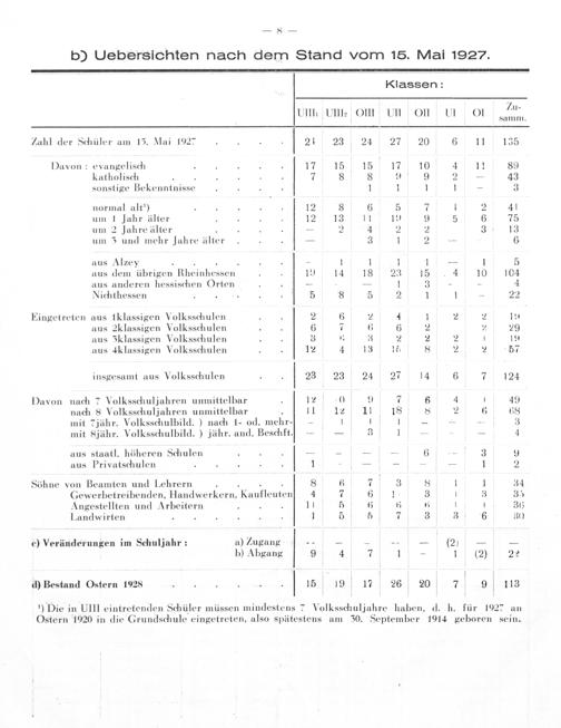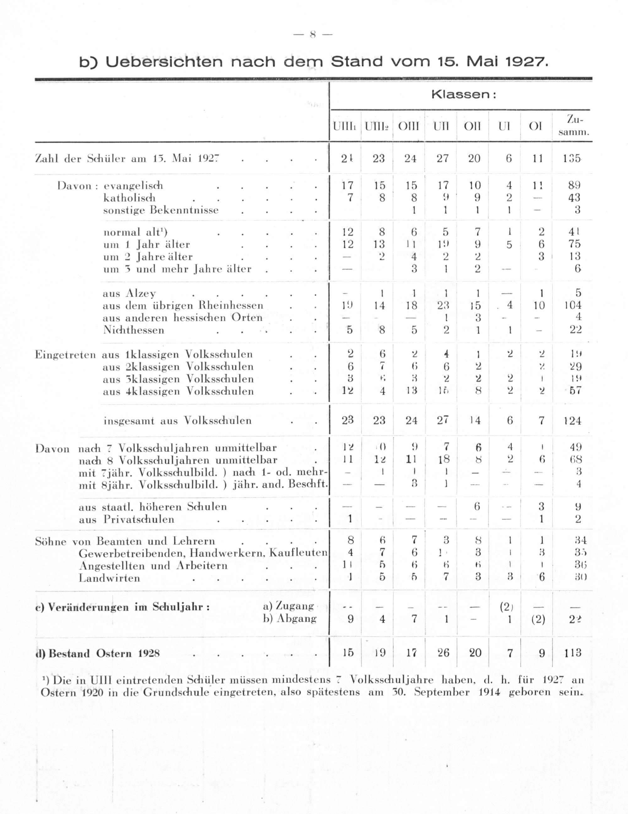 Zahl der Schüler am 15. Mai 1927 24.23 24 27.20 6 11 155 Davon: evangelisch 17 15 15| 17 10 4 11.89 katholisch 7 8 8 919 2— 43