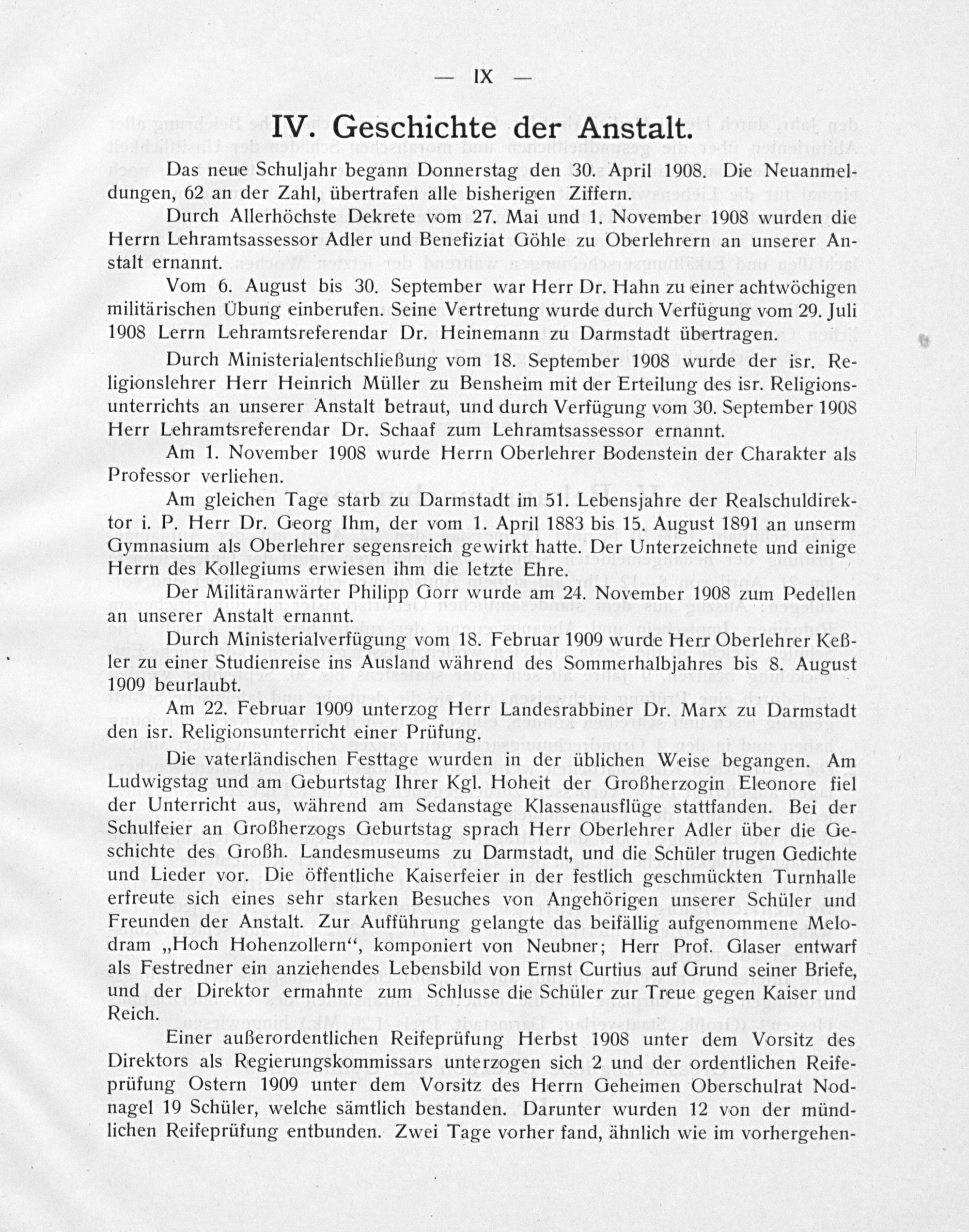 Durch Ministerialentschließung vom 18. September 1908 wurde der isr. Re- ligionslehrer Herr Heinrich Müller zu Bensheim mit der Erteilung des isr. Religions- unterrichts an unserer Anstalt betraut, und durch Verfügung vom 30. September 1008 Herr Lehramtsreferendar Dr. Schaaf zum Lehramtsassessor ernannt.