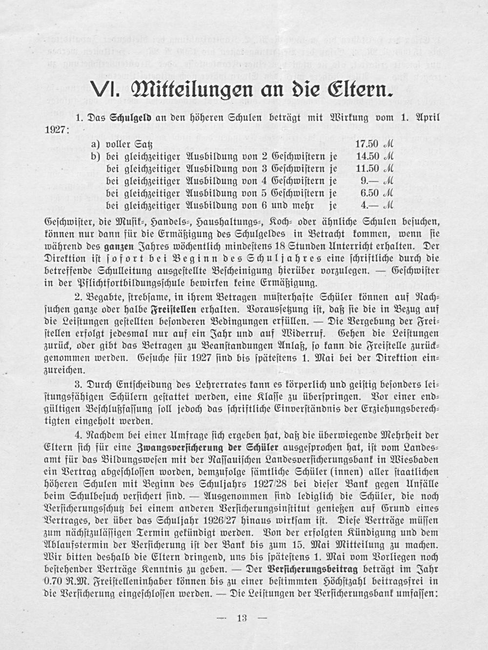 1. Das Schulgeld an den höheren Schulen beträgt mit Wirkung vom 1. April 1927: a) voller Satz 17.50 ℳ b) bei gleichzeitiger Ausbildung von 2 Geſchwiſtern je 14.50 ℳ bei gleichzeitiger Ausbildung von 3 Geſchwiſtern je 11.50 ℳ bei gleichzeitiger Ausbildung von 4 Geſchwiſtern je 9.— ℳ bei gleichzeitiger Ausbildung von 5 Geſchwiſtern je 6.50 ℳ bei gleichzeitiger Ausbildung von 6 und mehr je 4.— ℳ
