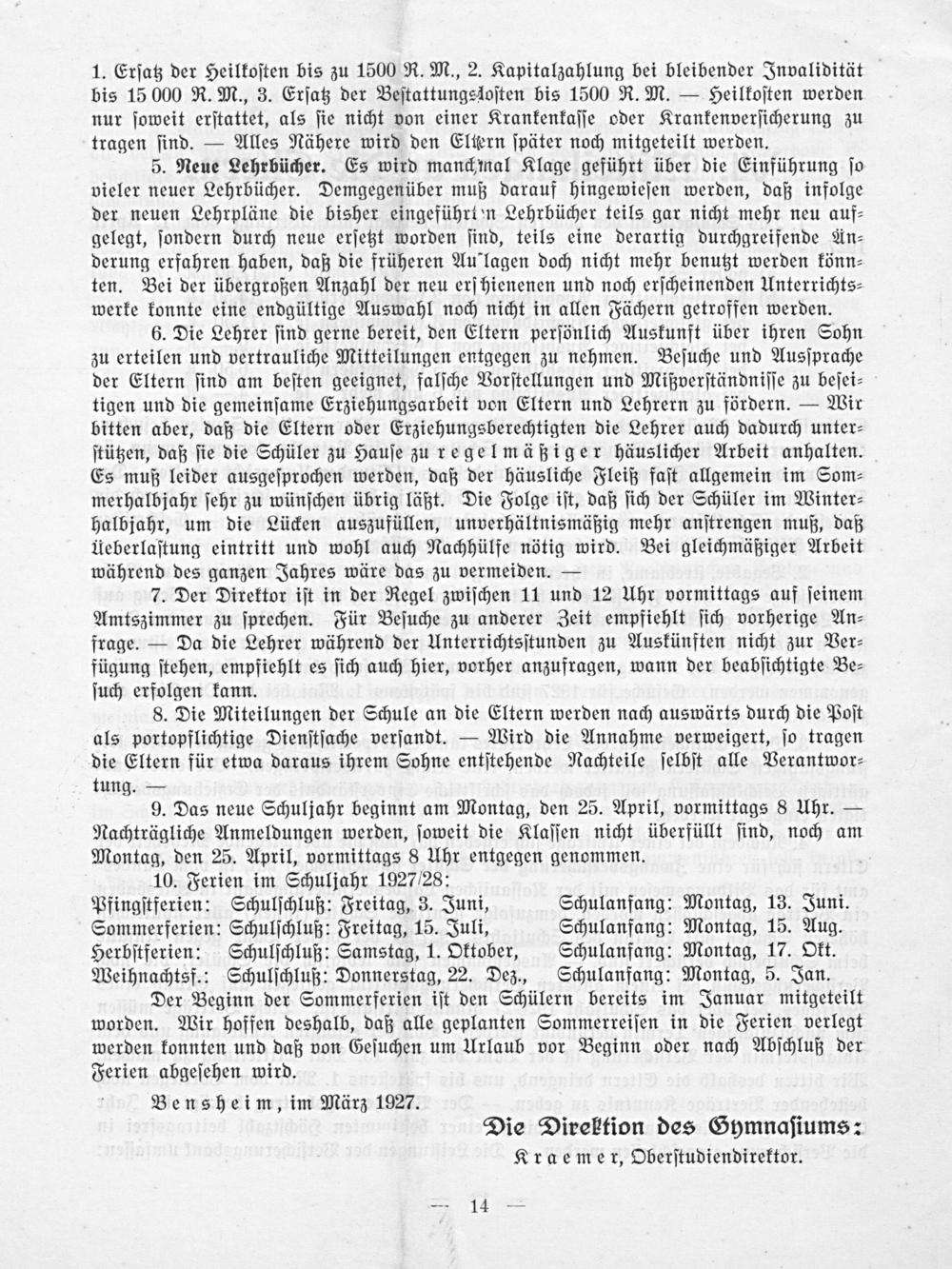 Die Direktion des Gymnaſiums: Kraemer, Oberſtudiendirektor.