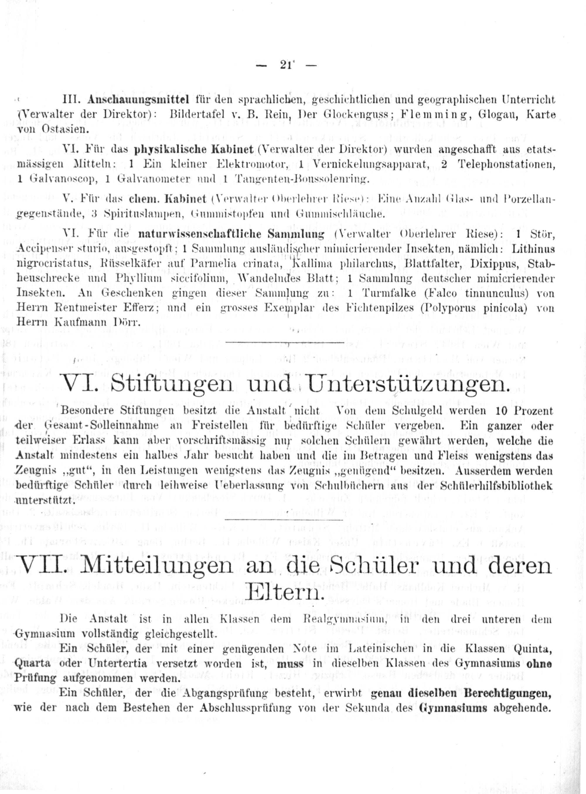 VI. Für das physikalische Kabinet(Verwalter der Direktor) wurden angeschafft aus etats- mässigen Mitteln: 1 Ein kleiner Elektromotor, 1 Vernickelungsapparat, 2 Telephonstationen, 1 Galvanoscop, 1 Galvanometer und 1 Tangenten-Boussolenring.