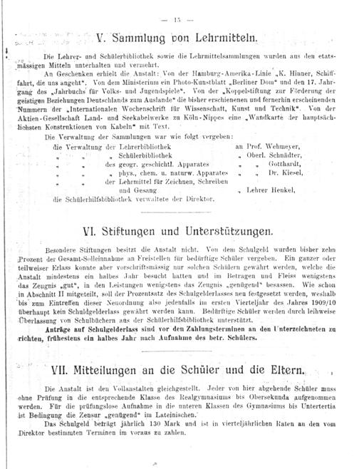 Besondere Stiftungen besitzt die Anstalt nicht. Von dem Schulgeld wurden bisher zehn Prozent der Gesamt-Solleinnahme an Freistellen für bedürftige Schüler vergeben. Ein ganzer oder teilweiser Erlass konnte aber vorschriftsmässig nur solchen Schülern gewährt werden, welche die Anstalt mindestens ein halbes Jahr besucht hatten und im Betragen und Fleiss wenigstens das Zeugnis„gut“, in den Leistungen wenigstens das Zeugnis„genügend“ besassen. Wie schon in Abschnitt II mitgeteilt, soll der Prozentsatz des Schulgelderlasses neu festgesetzt werden, weshalb bis zum Eintreffen dieser Neuordnung also jedenfalls im ersten Vierteljahr des Jahres 1909/10 überhaupt kein Schuldgelderlass gewährt werden kann. Bedürftige Schüler werden durch leihweise Überlassung von Schulbüchern aus der Schülerhilfsbibliothek unterstützt.