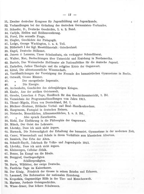 41. Walter, Max, Beobachtungen über Unterricht und Erziehung in Nordamerika. 42. Bartels, Das Weimarische Hoftheater als Nationalbühne für die deutsche Jugend. 43. Zurhellen, Jathos Theologie und die religiöse Krisis der Gegenwart.