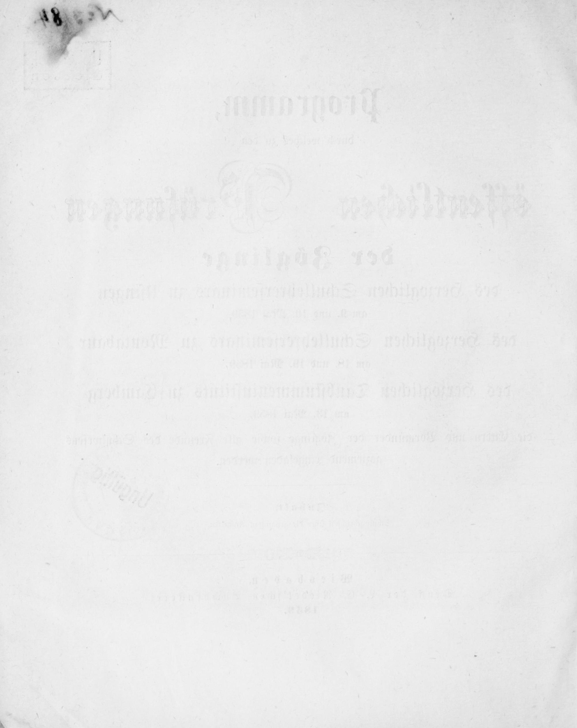 Programm durch welches zu den öffentlichen Prüfungen der Zöglinge des Herzoglichen Schullehrerseminars zu Usingen am ..., des Herzoglichen Schullehrerseminars zu Montabaur am ..., des Herzoglichen Taubstummeninstituts zu Camberg am ... die Eltern und Vormünder der Zöglinge und alle Freunde des Schulwesens geziemend eingeladen werden