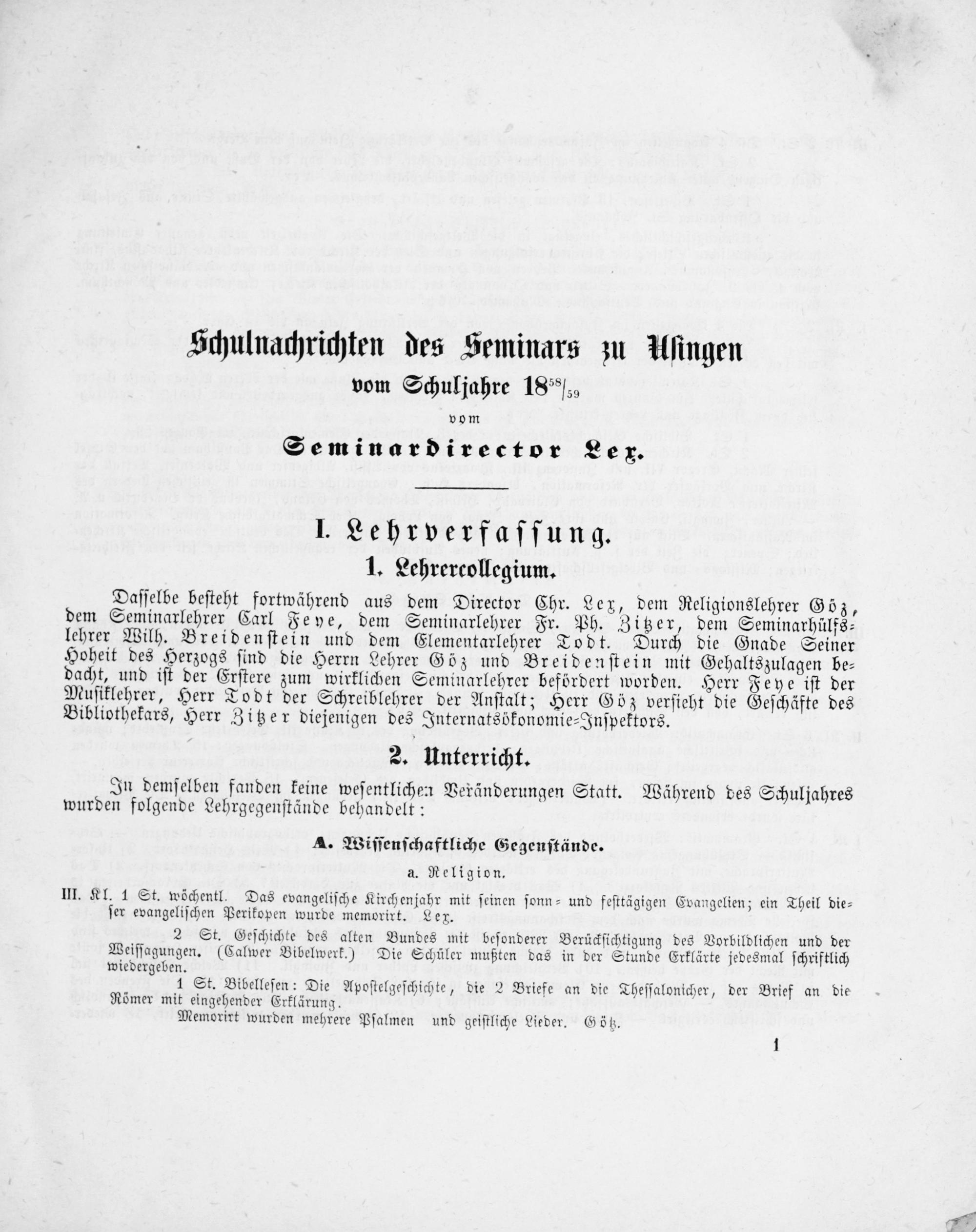 Daſſelbe beſteht fortwährend aus dem Director Chr. Lex, dem Religionslehrer Göz, dem Seminarlehrer Carl Feye, dem Seminarlehrer Fr. Ph. Zitzer, dem Seminarhülfs⸗ lehrer Wilh. Breidenſtein und dem Elementarlehrer Todt. Durch die Gnade Seiner Hoheit des Herzogs ſind die Herrn Lehrer Göz und Breidenſtein mit Gehaltszulagen be— dacht, und iſt der Erſtere zum wirklichen Seminarlehrer befördert worden. Herr Feye iſt der Muſiklehrer, Herr Todt der Schreiblehrer der Anſtalt; Herr Göz verſieht die Geſchäfte des Bibliothekars, Herr Zitzer diejenigen des Internatsökonomie⸗Inſpektors.