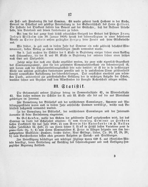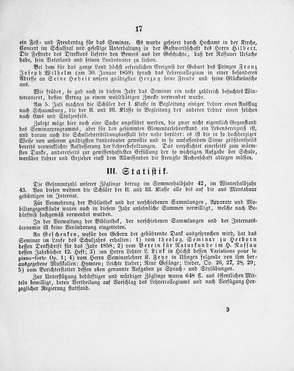 An Geſchenken, wofür den Gebern der gebührende Dank ausgeſprochen wird, hat das Seminar im Laufe des Schuljahrs erhalten: 1) vom theolog. Seminar zu Herborn deſſen Denkſchrift für das Jahr 1858; 2) vom Verein für Naturkunde im H. Naſſau deſſen Jahrbücher 12. Heft; 3) von Herrn Lehrer L. Link in Höchſt deſſen Variations pour le piano-forte Op. 1; 4) vom Herrn Seminarlehrer K. Feye in Uſingen folgende von ihm her⸗ ausgegebene Muſikalien: Hymnen; Leichte Lieder; Neue Geſänge; Lieder, Op. 26, 27, 28, 29; 5) vom Berichterſtatter deſſen oben genannte Aufgaben zu Sprach⸗ und Stylübungen.